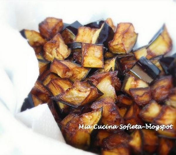 Bakłażan smażymy w głębokim tłuszczu do lekkiego zbrązowienia i osuszamy z nadmiaru tłuszczu.Na suchej, teflonowej patelni prażymy