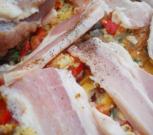 mięsa układamy omlet (mój się niestety troszeczkę rozpadł, ale ułożyłam go równomiernie na całej powierzchni