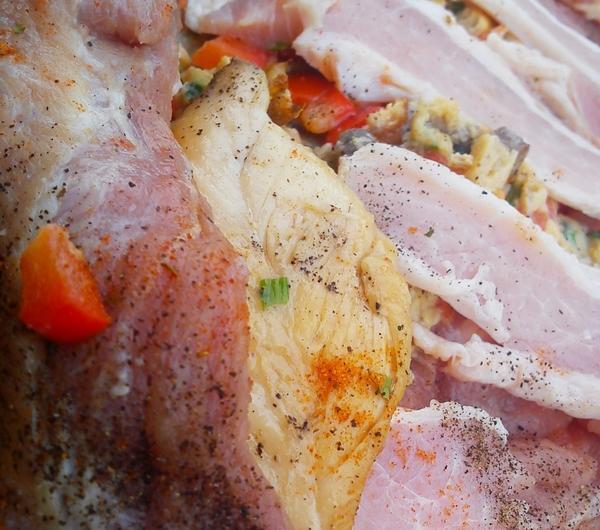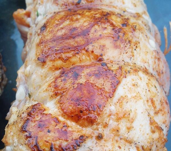 kurczaka. Wszystko razem ciasno zwijamy i związujemy nitką, by nic się nie rozpadło. Roladę obsmażamy w brytfance na pozostałym