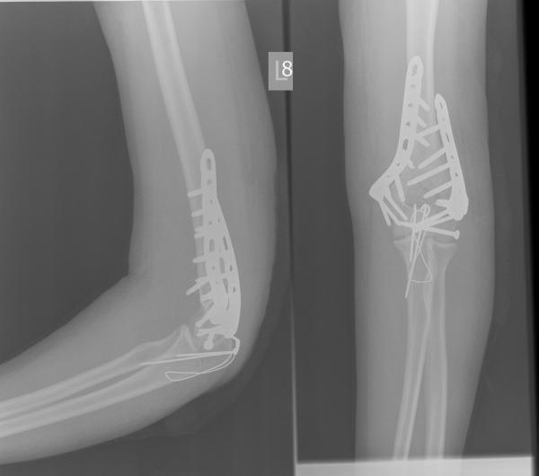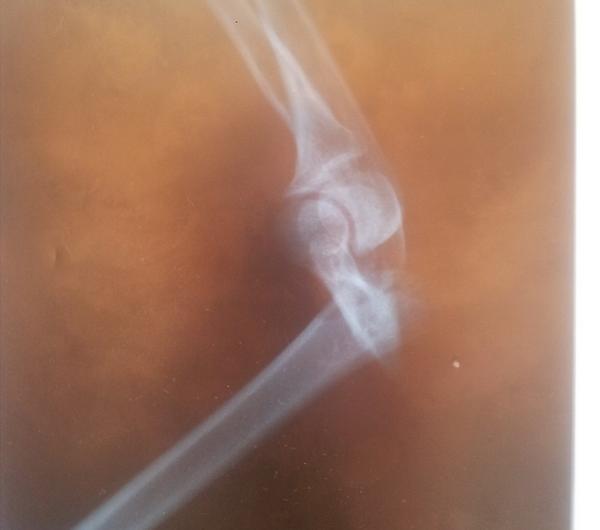 Ta kość, która jest prostopadła, powinna być równoległa, tak. W wyniku wielu dziwnych przygód z naszą ukochaną, polską służbą zdrowia, już tydzień później wyglądało to tak.