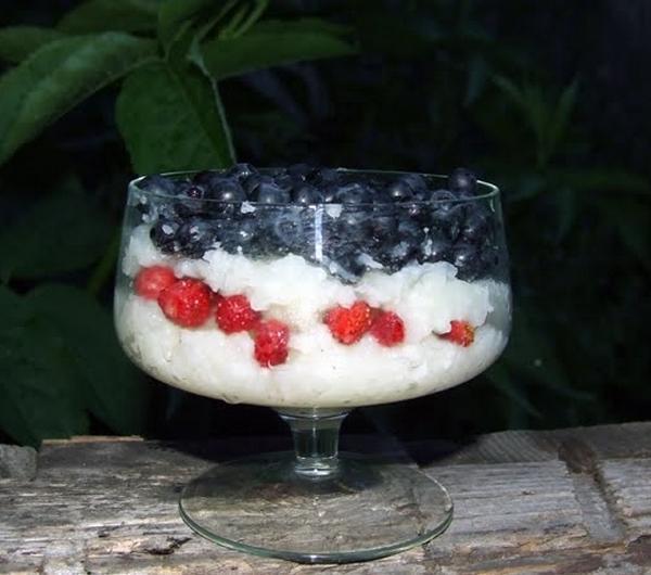 Wykonanie:Płatki ryżowe gotujemy w takiej ilości wody, aby całość miała konsystencję zupy, po to aby jeszcze możnabyło zagęścić budyniem. W małej ilości wody rozpuszczamy budyń i dodajemy do gotujących się płatków i energicznie mieszamy. Układamy warstwowo jak na obrazku. Schładzamy. Jemy.Przy okazji wizyty nad jednym z jezior możnabyło spotkać inne dary lasu, równie wartościowe choć na inny sposób, które można wykorzystać w kuchni. To nie koniec niespodzianek. Okazało się, że tak daleko na południu można spotkać ekosystem prawie identyczny jak nad morzem. Piaszczyste wydmy, powykrzywiane małe sosny i tylko woda słodka i fale mniejsze :)