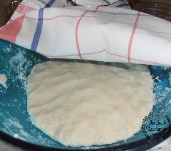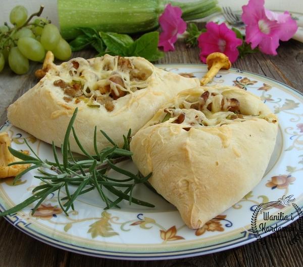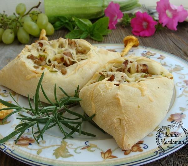 Składniki:Ciasto drożdżowe:25 dag mąki pszennej25 dag mąki krupczatki3 dag drożdży1/2 szklanki ciepłej wody1/2 szklanki ciepłego mleka1 płaska łyżeczka cukru1 płaska łyżeczka soli2 czubate łyżki majonezuFarsz:40 dag mięsa mielonego1/2 cukinii1 cebula2 ząbki czosnku1 papryczka chili20 dag świeżych kurek15 dag sera żółtego3 łyżki oleju1 łyżka masłasól do smakupieprz do smakuprzyprawa do mięsa mielonego do smakuSposób przygotowania:Ciasto: Mąkę pszenną wymieszać w misce z mąką krupczatką oraz solą. Ciepłą wodę połączyć z mlekiem oraz cukrem, dodać drożdże, oprószyć mąką i pozostawić zaczyn do wyrośnięcia, wymieszać z mąką, dodać majonez i wyrobić elastyczne ciasto, będzie się ono trochę kleić i będzie oporne ale tak ma być.Wyrobione ciasto zostawiamy w spokoju do wyrośnięcia w ciepłym miejscu-około 45 minut.