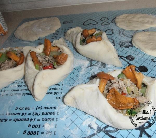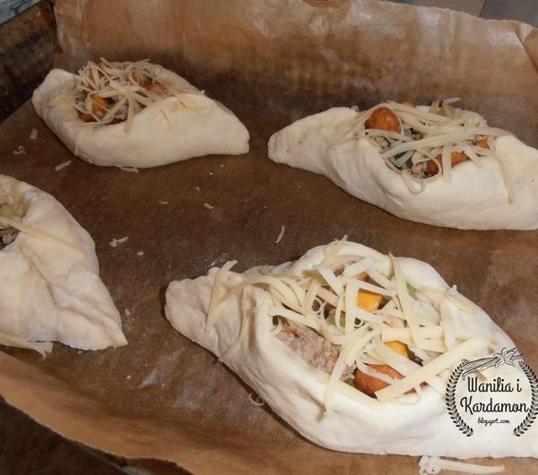 Wyrośnięte ciasto dzielimy na 8-10 okrągłych placków, nakładamy na środek farsz, brzegi podnosimy do góry, i zlepiamy na końcach,