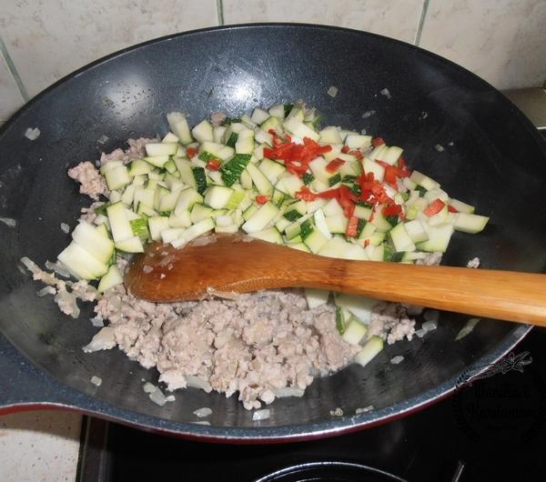Kurki opłukać większe pokroić na mniejsze kawałki, udusić na łyżce masła około 5 minut.Na oleju szklimy posiekaną w kostkę cebulę oraz czosnek, po chwili dodajemy mięso mielone, oprószamy przyprawami, smażymy 6-8 minut, po czym dodajemy cukinię i kurki, dusimy kolejne 3 minuty, odstawiamy do wystygnięcia.