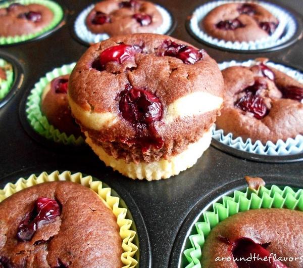 wiśnie z kompotu.Muffinki piecz w 180 C .przez 25 minut.