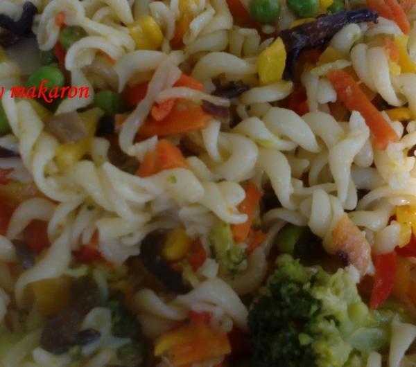 SKŁADNIKIopakowanie makaronu, typu świderki , wstążki1/2 puszki groszku zielonego1/2 puszki kukurydzy2 świeże marchewkimały brokuł20 dag pieczarek lub innych grzybówprzyprawy typu sól, pieprz, curry1 pomidor1/2 papryki czerwonej3 łyżki śmietanyWYKONANIEMakaron gotuje w osolonej wodzie. Tak, jak lubimy. Przelewamy zimną wodą.Marchewkę obieramy, strugamy w paski, brokuł dzielimy na małe różyczki, paprykę kroimy w kostkę. Pieczarki w paski.Do szerokiego garnka wlewamy szklankę wody, wrzucamy warzywa i pieczarki. Przykrywamy i dusimy, aż warzywa zmiękną.Pomidor sparzamy wrzącą woda ,ścigąmy skórkę, kroimy w kostkę dodajemy do warzyw.Wrzucamy również kukurydzę i groszek. Smażymy jeszcze ok 10 min.Pod koniec dodajemy śmietanę, przyprawiamy do smaku, mieszamy , jeszcze chwilę smażymy.Ugotowany makaron mieszamy z warzywami. Gotowe.