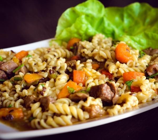 Jeden z moich ulubionych gulaszów, które robimy w domu. Składniki, których będziemy potrzebować do wykonania gulaszu to:- 0,5kg karkówki wieprzowej bez kości,- 1 duża, czerwona cebula,- dwie duże marchewki,- po połowie dużej, czerwonej, zielonej i żółtej papryki,- natka pietruszki,- miód (ok 4 duże łyżki),- siemię lniane (lub droższa, ale smaczniejsza wersja - orzechy nerkowca),- 4 duże ząbki świeżego czosnku,- przyprawy (sól, pieprz ziołowy, papryka tarta słodka i ostra, oregano, tymianek, bazylia, curry, inne wedle uznania),- pół litra bulionu warzywnego, kostka rosołowa lub bulionetka.Wykonanie gulaszu jest o wiele prostsze niż mogłoby się wydawać. Mięso kroimy w kostkę, doprawiamy solą i pieprzem, wrzucamy do bulionu, gotujemy aż mięso będzie gotowe, następnie dodajemy posiekaną drobno cebulę, czosnek, marchewkę i papryki.Doprawiamy do smaku cały czas gotując na małym ogniu. Czekamy aż warzywa zmiękną i raz jeszcze sprawdzamy smak, jeśli potrzeba znów przyprawiamy, dodajemy miód i siemię lniane. Gotujemy na tyle długo, aż sos zgęstnieje i wszystkie smaki nawzajem przejdą.Gdy gulasz jest już gotowy, wyłączamy ogień i przed podaniem dodajemy posiekaną pietruszkę, w innym wypadku straciłaby świeżość i swój piękny zielony kolor, ponieważ jest to roślina, która źle znosi obróbkę cieplną. Moim zdaniem najlepiej do tego dania pasuje makaron, jednak równie dobrze możemy zjeść je z ryżem, kaszą (zwłaszcza prażoną) lub po prostu z ziemniakami, jak kto woli.Smacznego! :)