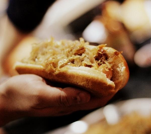 kapusta leciutko się przysmaży i skarmelizuje - tym lepiej.Do buły parówa, na nią