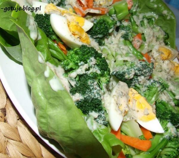 Składniki:2 porcje:1 brokułkila listków sałaty1 marchew4 ugotowane na twardo jajasos1 szklanka jogurtu naturalnego4 ząbki czosnku2 łyżki miodu1 łyżka majerankusól, pieprzPrzygotowanie:Czosnek siekamy i mieszamy z resztą składników sosu.Brokuł dzielimy na różyczki i wkładamy je do osolonego wrzątku, gotujemy 5-7 minut. Po tym czasie przelewamy zimną wodą.Sałatę myjemy, układamy na talerzu, marchew obieramy, kroimy w półplasterki.Na sałacie układamy brokuła, ćwiartki jaj, posypujemy marchewką, polewamy sosem i podajemy.Powiązane notki:Sałatka wiosenna z rzeżuchąSałatka z buncem marynowanymSałatka śledziowa z kurkumąNowy dział ! Dla niemowląt : zupka brokułowa z żółtkiem ( po 7 miesiącu )Kurczak w sosie kokosowym z kurkumą