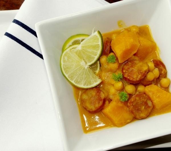Opis : Szukając przepisu na jakąś nową zupę, idealnie trafiłam na ten właśnie przepis.Nigdy nie jadłam ciecierzycy, zupy z dyni, zupy z chorizo, choć to ostatnie bardzo lubię, ponieważ przypomina mi salami, które uwielbiam. Gdy tylko przeczytałam przepis, stwierdziłam, że muszę zrobić tą zupę, a moje braki w niewiedzy dotyczącej smaków tych poszczególnych produktów będą zaspokojone.Autor przepisu zatytułował ją swoją ulubioną, ale ja nie przywiązuję wagi do takich określeń, póki sama nie spróbuję, czy przyjmie się w moim mniemaniu.Dopiero, gdy chorizo puściło soki, a dynia dodała lekkiej słodyczy i barwy całej zupie, wiedziałam, że zapowiada się coś smacznego. I tak też było. Zupa w rezultacie końcowym bardzo mi zasmakowała. Ma taki swojski smak, bo przypomina mi trochę naszą polską zupę fasolową.Idealnie nadaje się na każdą porę roku, a ja upodobałam ją sobie szczególnie w szare, zimowe dni.Szybko się ją przyrządza.Szczerze polecam.Pochodzenie : przepis z internetu (fig&cherry)Ilość : 2-3 porcje; całość zupy to ok. 1 , 11 , 1 lSkładniki :0 , 5 kg dyni (liczyć przed oczyszczeniem i obraniem)1 łyżeczka masła + 1 łyżeczka oleju/1 płaska łyżka margaryny1 mniejsza cebula1 ząbek czosnku0,5-1 łyżeczka chilli1 kiełbasa chorizo30-50 ml wody500 ml bulionu (może być z kostki) lub wody50 ml słodkiej śmietanki200 g ugotowanej ciecierzycyPrzygotowanie :Dynię oczyścić z pestek i "makaronikowego" miąższu (ma pozostać sam twardy miąższ).Obrać ze skóry.Pokroić w większą kostkę.W garnku/rondlu rozgrzać tłuszcz.Dodać cebulę pokrojoną w kostkę.Dodać czosnek przeciśnięty przez praskę.Smażyć na średnim płomieniu, aż cebula zacznie lekko brązowieć.Dodać chilli (ja dałam 1 łyżeczkę, żeby było lekko pikantne).Wymieszać.Dodać kiełbasę chorizo pokrojoną w krążki.Wlać wodę.Wymieszać wszystko.Smażyć/Dusić ok. 2 min.Dodać przygotowaną wcześniej dynię.Zalać bulionem/wodą.Gotować 10-15 min. pod przykryciem, do momentu, kiedy dynia zmięknie.Zupę odstawić z płomienia.Wyciągnąć z niej 1/2-2/3 zawartości dyni z odrobiną wywaru.Zmiksować blenderem na gładką masę.Płyn wlać z powrotem do pozostałej zupy.Wlać śmietankę.Wszystko wymieszać.Dodać ciecierzycę.Włączyć na nowo płomień i lekko podgrzać, aby ciecierzyca uzyskała temp. podobną do pozostałych składników zupy.W razie konieczności doprawić solą i pieprzem.Podawać na ciepło solo lub z pieczywem, można pokropić sokiem z limetki/cytryny.