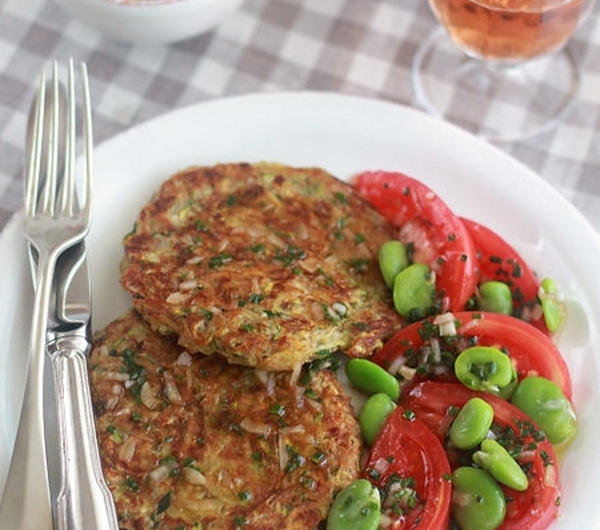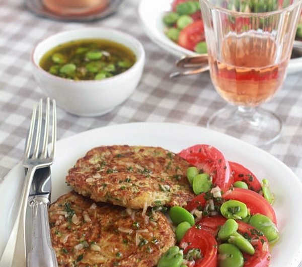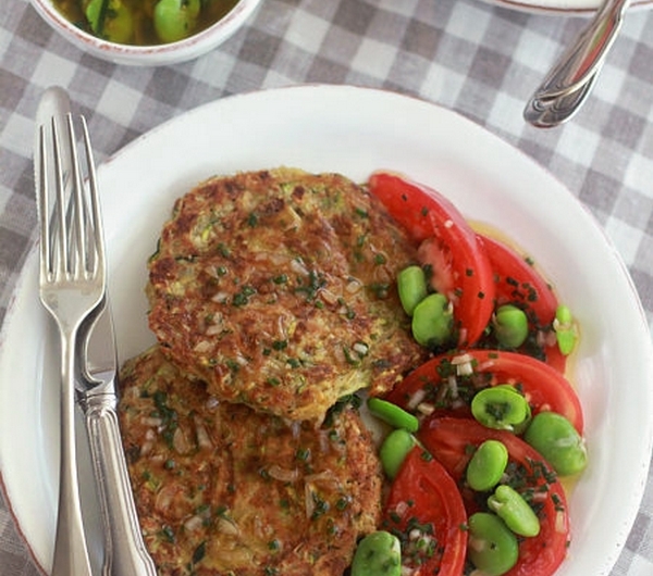 2-3 porcje (ok. 10 placków o śr. 10 cm)ok. 650 g warzyw(u mnie ok. 280 g ziemniaków + ok. 370 g cukinii)1 łyżka zmielonego siemienia lnianego (lub 1duże jajko)1 cebula dymka lub szalotka2 ząbki czosnku5 – 6 łyżek (z małą ‘górką’) posiekanej mięty i pietruszki (pół na pół) lub bazyliiotarta skórka z ½ cytryny (można pominąć)sól, pieprz do smakuopcjonalnie – szczypta papryczki z Espelettedo zagęszczenia : kilka łyżek b. drobno zmielonych migdałówlub orzechów (lub mąki, np. razowej)Siemię lniane wymieszać dokładnie z 2-3 łyżkami wody i odstawić (pominąć, jeśli dodajemy jajko).Cebulę / szalotkę bardzo drobno poszatkować, czosnek przecisnąć przez praskę.Ziemniaki obrać, cukinię umyć i osuszyć; warzywa zetrzeć na średnich oczkach i odcisnąć. Wszystkie składniki dobrze wymieszać, doprawić do smaku (jeśli masa jest zbyt rzadka, dodajemy zmielone migdały lub ewentualnie 1-2 łyżki mąki). Na rozgrzaną patelnię nakładać po ok. 2 łyżki masy i smażyć placuszki po kilka minut z każdej strony, aż będą rumiane (uwaga – placki są dosyć delikatne, należy więc ostrożnie je przewracać).Podawać na ciepło lub na zimno, np. – jak wyżej – z sałatką pomidorową i bobem, czy np. z sosem jogurtowo-czosnkowym.Sałatka z bobu i pomidorów tak prosta, że prościej się nie da : ugotowany na parze (ok. 3 minuty), wciąż al dente bób, pomidory pokrojone w ósemki i do tego sos – szalotka, posiekany szczypiorek, nieco natki pietruszki i bazylii, sól i pieprz do smaku, dużo dobrej oliwy i odrobina octu balsamicznego. Et voilà :)(lubię też od czasu do czasu dodatek zrumienionych na suchej patelni orzeszków piniowych, ale oczywiście nie jest to konieczne; sosu ziołowego przygotowuję więcej i polewam nim również placki)