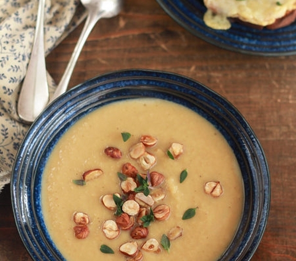 500 g selera (waga po obraniu)1 jabłkook. 100 – 120 g białej części pora1 szalotka3 ząbki wędzonego czonsku½ łyżeczki wędzonej papryki (można pominąć)ok. litr wywarukilka gałązek tymiankusos sojowy lub sól – do smakuświeżo mielony pieprz z młynkadodatkowo :orzechy laskowe / grzanki serowePiekarnik nagrzać do 200°.Seler obrać i pokroić w kostkę (nie za dużą). Jabłko obrać, pozbawić gniazd nasiennych i pokroić w ćwiartki lub w dużą kostkę, a następnie wraz z selerem przełożyć do naczynia żaroodpornego, skropić oliwą, lekko posolić, dodać gałązki tymianku i wymieszać. Piec do miękkości (ok. 40 minut).Por umyć, osuszyć i pokroić w plasterki. Szalotkę drobno poszatkować.Gdy seler zaczyna być już miękki, szalotkę lekko podsmażyć na rozgrzanym tłuszczu (kilka minut, nie doprowadzając do zrumienienia), a następnie dodać por oraz przeciśnięty przez praskę czosnek (i ewntualną paprykę) i dusić kilka – kilkanaście minut. Następnie dodać upieczony seler z jabłkiem (oddzielam gałązki tymianku), wymieszać, dodać bulion i doprawić do smaku. Gotować jeszcze chwilę, po czym zmiksować.Podawać np. ze zrumienionymi na suchej patelni orzechami (staram się pokroić je w ‘plastry’) i listkami tymianku oraz z serowymi grzankami (przygotowuję je podobnie jak do zupy cebulowej, grillując je chwilę w piekarniku).Uwagi :- sos sojowy można oczywiście pominąć i doprawić zupę solą, mnie jednak wyjątkowo pasuje tutaj jego wędzony posmak, a dodatkowo zupa nabiera bursztynowego koloru :)(można też w zamian użyć odrobiny wędzonej soli, np. Maldon)- zamiast tymianku można użyć również majeranku (tak jak we wspomnianej wcześniej zupie ziemniaczanej)- czosnek można też upiec (razem z warzywami lub tak jak tutaj – klik, bezpośrednio całą główkę)‚Pozdrawiam serdecznie!‚