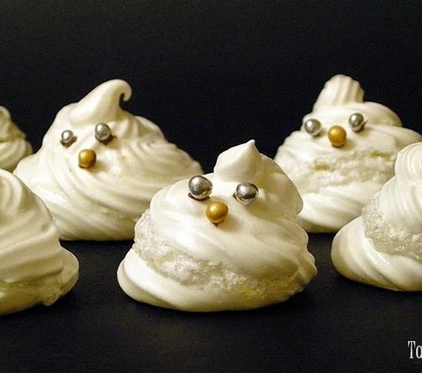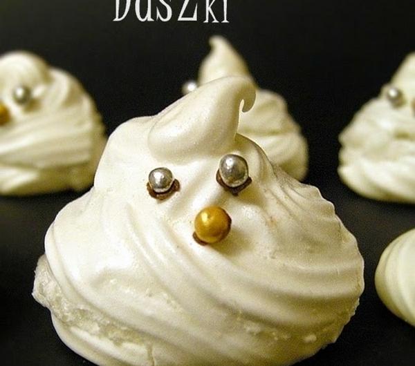 Bezowe duszki wcale nie straszą, tylko poprawiają humorSą pyszne, słodkie i bardzo kruchePrzepis na około 20 bezowych duszków2 białka200 g cukru pudru1 łyżka cukru waniliowego1 łyżeczka z soku z cytrynycukiernicze perełki do dekoracjikrem czekoladowy lub orzechowy do chlebaPrzygotowanieBiałka ubijamy na sztywną pianę. Gdy piana jest ubita, stopniowo wsypujemy, po jednej łyżce cukier puder i ubijamy, aż połączy się z pianą. Cały czas ubijając dodajemy cukier waniliowy i sok z cytryny. Ubijamy, aż piana z białek stanie się lśniącaPiekarnik nagrzewamy do 130 stopni (góra-dół)Dużą blachę wykładamy papierem do pieczenia. Następnie łyżką lub rękawem cukierniczym (użyłam rękawa) tworzymy małe bezyBezy wkładamy do piekarnika i pieczemy przez 30 minut przy lekko uchylonych drzwiczkach (można między nie włożyć drewnianą łyżkę). Chodzi o to, żeby bezy bardziej się ususzyły, niż upiekłyPo upływie 30 minut wyłączamy piekarnik, zamykamy drzwiczki i zostawiamy bezy na całą noc. Przez ten czas bezy skruszejąNa drugi dzień z perełek tworzymy oczy i noski, które przyklejamy na odrobinie kremu czekoladowegoSmacznego!Zapraszam do polubienia mojej strony na Facebook'u