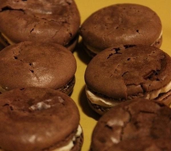 Składniki:70 g białek, wysuszonych przez 3-5 dni na blacie (białka przelewamy do miseczki i odstawiamy w temp. pokojowej na 3-5 dni)170 g cukru pudru, w proporcji 35:135100 g mąki migdałowej (użyłam zmielonych płatków migdałowych)1 łyżka gorzkiego kakaoWykonanie:Białka ubić na średnio sztywno, dodać 35g cukru pudru i ubić maksymalnie. 135g cukru pudru przesiać z mąką migdałową i kakao. Wmieszać sypkie składniki do białek.Przełożyć do rękawa cukierniczego, wycisnąć równe krążki na blachę wyłożoną pergaminem (lepiej matą teflonową, gdyż z niej wygodniej się odklejają makaroniki po upieczeniu). Blachą należy delikatnie, ale stanowczo uderzyć o miękką powierzchnię, najlepsze jest do tego łóżko lub tapczan, by masa równomiernie się rozłożyła, a ewentualne czubeczki pochowały. Ciasteczka można posypać czymś (np. sproszkowanymi owocami, drobno zmielonymi, lub drobno zmieloną kawą). Potem odkładamy blachy na ok. 30 minut, by makaroniki podeschły i utworzyła się na nich cienka skorupka (będzie można bez przyklejenia dotknąć je delikatnie palcem). Piec w 140 stopniach przez ok. 12-15 minut. Czas pieczenia w każdym piekarniku może być różny (ja piekłam w niższej temperaturze). Makaroniki nie powinny się zbrązowieć!Ostudzone makaroniki przekładać kremem i podawać.Krem maślany:100gr cukru2 duże białka jajek180gr masła w temperaturze pokojowej1/4 do1/2 łyżeczki cynamonu1/8 łyżeczki gałki muszkatołowejBiałka i cukier włóż do miski i ustaw nad garnkiem z wrzącą wodą. Ubijaj cały czas nad parą, aż masa będzie ciepła w dotyku, przez około 3 minuty. Cukier ma się rozpuścić. Przelać białka do stacjonarnego miksera i ubijać pianę na średniej prędkości aż ostygnie i będą formować się górki, przez około 5 minut. Po łyżce dodawać masło, cały czas ubijając aż masa będzie gładka. Jak włożymy już całe masło ubijamy dalej na średniej prędkości, aż masa zgęstnieje i będzie głądka. Trwa to około 6-10 minut.A tak makaroniki wyglądają z wierzchu: