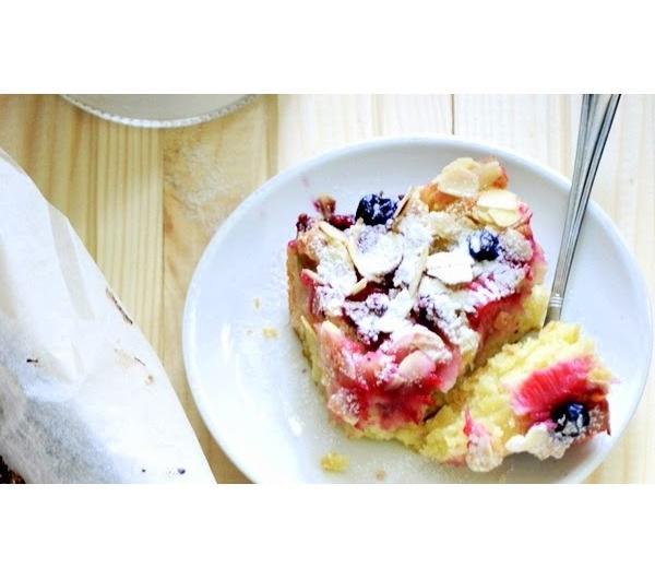 Składniki:ok. 250 g rabarbaru (dałam mniej i to był błąd)150 g mąki40 g drobno zmielonych migdałów1 łyżeczka proszku do pieczenia80 g miękkiego masła (lub nieutwardzanej margaryny)130 g cukru2 jajka100 ml jogurtu2 łyżki amaretto (lub 2 dodatkowe łyżki jogurtu)otarta skórka z 1 cytryny1/2 dużego startego ziarenka tonki (lub nasionka z 1 laski wanilii / cukier waniliowy)dodatkowo : 1-2 łyżki jasnego cukru trzcinowego wymieszanego z odrobiną startej tonki lub cynamonu (lub cukru waniliowego)opcjonalnie : płatki migdałowe do posypania lub kruszonka migdałowa