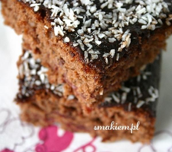 Składniki (na blachę 25x35 cm):250 g margaryny1½ szklanki cukru½ szklanki mleka3 łyżki kakao2 łyżki kawy mielonej½ łyżeczki aromatu rumowego (lub dwie łyżki rumu)2 szklanki mąki4 jajka (potrzebne będą białka i żółtka osobno)15 g (3 płaskie łyżeczki) proszku do pieczenia200 g wiśni (drylowanych, najlepiej z zalewy, odsączonych)2 garście wiórków kokosowychW rondelku roztopić margarynę, dodać cukier, mleko, kakao, kawę i aromat (lub alkohol). Podgrzewać mieszając, aż do całkowitego rozpuszczenia cukru. Ostudzić. Z ostudzonej masy odlać pół szklanki, odstawić.Rozgrzać piekarnik do 190 stopni.Mąkę wymieszać z proszkiem do pieczenia, żółtkami i resztą masy. Wmieszać wiśnie.Białka ubić ze szczyptą soli na lekką pianę. Dodać łyżkę cukru i ubić na pianę sztywną.Do ciasta wmieszać delikatnie ale stanowczo pianę z białek. Nie zwlekając przelać do formy i wstawić do nagrzanego piekarnika.Piec ok. 50 minut, do momentu, kiedy środek ciasta jest sprężysty, a szpikulec włożony w samym środku, do dna, jest po wyjęciu suchy i czysty.Ciasto wyjąć, odstawić na chwilę. Lekko podgrzać pozostałe pół szklanki polewy i równomiernie rozprowadzić na powierzchni i bokach ciasta. Posypać wiórkami kokosowymi.