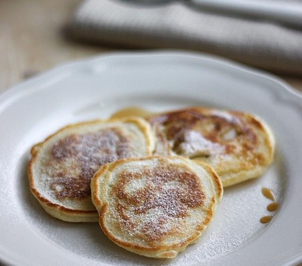 Składniki (na 2-4 porcje):1 1/2 szklanki mąki2 łyżeczki proszku do pieczenia3 łyżki cukruszczypta soli1/2 szklanki kwaśnej śmietany3/4 szklanki mleka2 duże jajka1 łyżeczka ekstraktu waniliowego2 bananycukier puder, syrop klonowyW jednej misce wymieszać przesianą mąkę, proszek do pieczenia, cukier i sól.W drugiej – śmietanę, mleko, jajka i ekstrakt.Składniki suche i mokre wymieszać - tylko do połączenia - łyżką lub widelcem.Banany obrać, pokroić w ćwierćplasterki/kosteczkę wielkości centymetra.Na rozgrzaną, natłuszczą patelnię (można smażyć je bez tłuszczu na patelni nieprzywieralnej, ale wtedy nie uzyskamy chrupiących krawędzi ;) ) wykładać niewielkie porcje ciasta, które uformują placki o średnicy kilku centymetrów.Od razu rozsypywać na każdym po 5-6 kosteczek banana.Smażyć minutę – dwie na średnim ogniu, aż na ich powierzchni ukażą się pęcherzyki, a spód będzie rumiany. Wtedy odwracać, smażyć, aż zrumienią się z drugiej strony i będą dopieczone w środku.Gorące posypywać cukrem pudrem i kropić syropem klonowym.