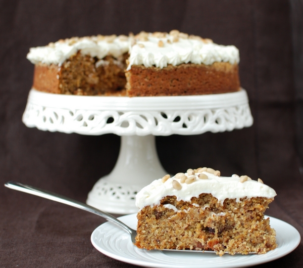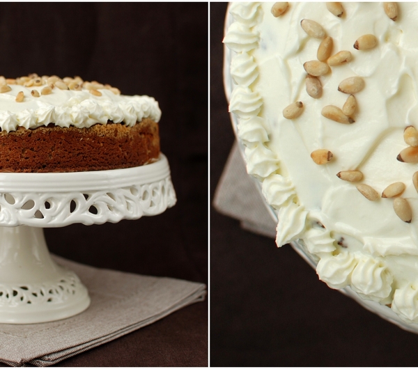 „Niebo w gębie!”Ten tort to niekończąca się lista zalet! Nie zawiera cukru, ani mąki! W jego składzie są natomiast: migdały i/lub orzechy, marchew oraz oliwa z oliwek.Jest wilgotny i niezmiernie aromatyczny, dzięki dodatkowi gałki muszkatołowej, cynamonu oraz skórki cytrynowej!Przepyszny krem jest zrobiony na bazie serka mascarpone.Gorąco polecam! Zachwyci każdego :)Jest to moja adaptacja tego przepisu.Uwaga:)W wersji oryginalnej ciasto było z dodatkiem mielonych migdałów. Mnie „życie” zmusiło (czytaj: „brak wystarczającej ilości mielonych migdałów”) do zastąpienia części migdałów mielonymi orzechami laskowymi. Nie wiem jak smakuje ciasto z samymi migdałami, ale zaręczam, że to z orzechami jest wspaniałe. Myślę, że w zależności od zasobów spiżarni możemy pokusić się o pieczenie tego tortu z dowolną kombinacją mielonych orzechów (włoskie, laskowe…) i/lub migdałów. Zachęcam do eksperymentów :)Składniki:2 średnie marchewki utarte na drobnej tarce75 g (ok 1/2 szklanki) rodzynek i/lub suszonej żurawiny (ale mogą być także pokrojone drobno figi, morele, śliwki)60 ml rumu100 g cukru brzozowego125 ml delikatnej oliwy z oliwek1 łyżeczka ekstraktu waniliowego3 jajka150 g mielonych migdałów200 g mielonych orzechów (laskowych, włoskich…)1/4 łyżeczki tartej gałki muszkatołowej1 łyżeczka cynamonu1 łyżeczka proszku do pieczeniadrobno starta skórka z całej cytrynysok z 1/2 cytryny3 łyżki uprażonych orzeszków piniowychdodatkowo:oliwa/margaryna – do nasmarowania boków tortownicy1-2 łyżki mielonych orzechów/migdałów – do obsypania boków tortownicyNa krem z mascarpone:250 g serka mascarpone1 łyżka syropu z agawy (fruktozy/cukru brzozowego)2-3 łyżki likieru pomarańczowego (lub migdałowego lub rumu/brandy)Wykonanie:Rozgrzać piekarnik do 180stopni.Dno okrągłej tortownicy (średnica 23 cm) wyłożyć papierem do pieczenia, a boki nasmarować oliwą/margaryną i wysypać mielonymi orzechami.Uprażyć orzeszki piniowe na suchej patelni, aż będą złociste.Zetrzeć marchewkę na tarce i ewentualnie zostawić na sitku do odcieknięcia. (Uwaga: u mnie nie było to konieczne.)Rodzynki i żurawin zalać rumem i lekko podgrzać (w kuchence mikrofalowej lub na kuchni). Odstawić do napęcznienia i wystygnięcia.Ubić cukier z oliwą aż mieszanina będzie lekko kremowa i dobrze napowietrzona. Dodać ekstrakt waniliowy i jajka, a gdy masa będzie jednolita dodać zmielone migdały, orzechy, utartą gałkę, cynamon, proszek do pieczenia, startą marchewkę, rodzynki i żurawinę razem z zalewą rumową, a na końcu skórkę i sok z cytryny.Przełożyć ciasto do foremki i wygładzić. Posypać ciasto połową orzeszków piniowych.Wstawić do piekarnika i piec około 45-55 minuut. (Uwaga: Ciasto trochę urośnie i się zezłoci, a patyczek będzie lepki, ale dość czysty po wyjęciu.)Wyjąć ciasto z piekarnika, odstawić w foremce do wystygnięcia.Przygotować krem. Zmiksować serek mascarpone z alkoholem i dosłodzić do smaku syropem z agawy.Zimne ciasto udekorować kremem i posypać resztą orzeszków piniowych.Smacznego:)