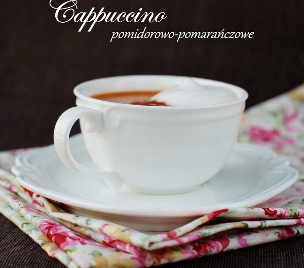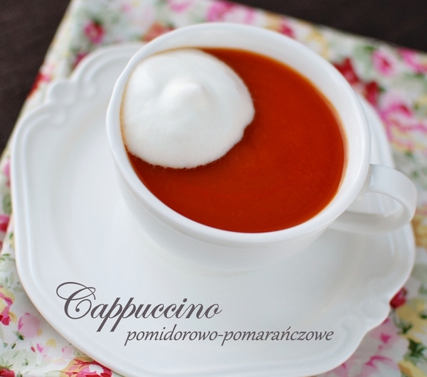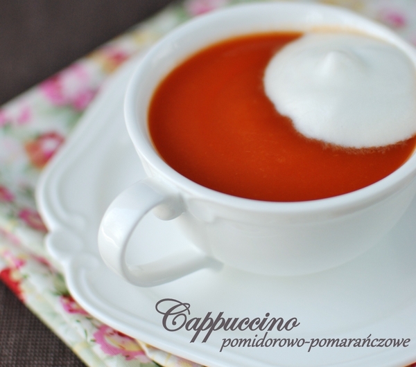 Krem pomidorowo-pomarańczowy podany w formie cappuccino to moja wersja przepysznej zupy, którą jadłam w Warszawie w restauracji „Joseph’s wine & food”.Zupę polecam wszystkim poszukującym nowych smaków ;)Uwaga:)Kucharz Joseph Seeletso, który otworzył ww. restaurację, znany także z programu „Dzień dobry TVN”, jest twórcą nowatorskiej kuchni, słynącym z niebanalnych połączeń potraw. Mnie najbardziej zaskoczył słodkim deserem podanym z… sosem czosnkowym ;)Składniki: (5-6 porcji)3 duże marchwie1 pomarańcza1 płaska łyżeczka tartej skórki pomarańczowej1 puszka pomidorów bez skórki (razem z sokiem)1 l wywaru warzywnego lub rosołu drobiowegooliwasól i pieprzszczypta cynamonudodatkowo:mleko 2 %spieniacz do mleka
