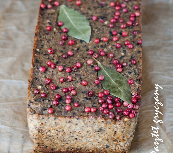 Składniki: (keksówka 25×10 cm)1/2 kg mięsa z udźca kurczaka (bez kości!)**1 średnia marchew1/2 średniego selera1 duża pietruszka2 średnie cebule3-4 ząbki czosnku6-8 średnich pieczarek1/2 szklanki oliwy1/2 szklanki suchej kaszy gryczanej ugotowanej na sypko (najlepiej na wywarze mięsnym lub warzywnym)*3 łyżki suchej kaszy gryczanej1 jajosól i pieprz2-3 łyżeczki majeranku1/2 łyżeczki kminku1/2 łyżeczki tartej gałki muszkatołowej (przepraszam, ale zapomniałam wcześniej dopisać tę ważną przyprawę…)do dekoracji: (opcjonalnie)czerwony pieprz w całościliście laurowe*Uwaga: Tutaj pisałam o tym jak ugotować kaszę na sypko. Za poradą pana Andrzeja, zamiast wody, do gotowania kaszy użyłam wywaru mięsnego. Kasza rzeczywiście bardzo zyskała na smaku :)**Uwaga: Może być także mięso z kością, tj. 3 całe podudzia z kurczaka. Należy je upiec razem z warzywami, tak jak w przepisie poniżej, a następnie oddzielić mięso od kości i zmielić. Kości można wykorzystać do ugotowania wywaru – przepis tutaj .
