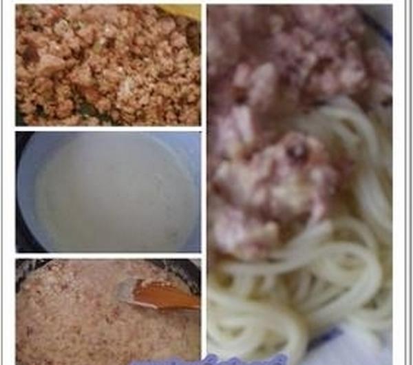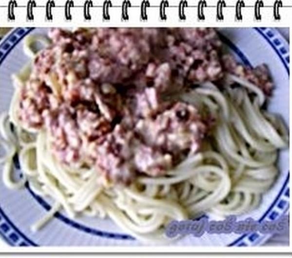 WYKONANIENa sos serowy:Podsmażyć na tłuszczu mielone mięso i pokrojoną w kostkę cebulę. Doprawić solą i pieprzem. Mleko i śmietanka, zagotować. Zagęścić mąką. Rozpuścić w sosie utarty ser. Nie gotować! Wymieszać z podsmażonym mięsem i cebulą. Podawać z ugotowany według przepisu na opakowaniu makaronem spaghetti.