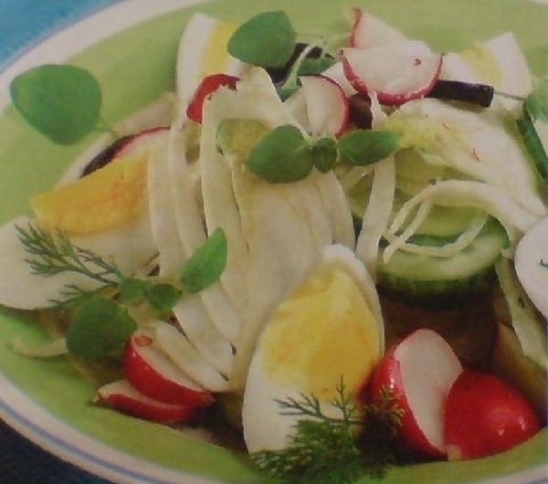 Dodaj przepis do ulubionych!(ilość porcji): 4(z pieczeniem / smażeniem): 25 minut(stopień trudności):Oceń przepisMożesz ocenić ten przepis nie rejestrując się u nas!Średnia ocena użytkowników : 0Ilość ocen : 0SkładnikLogo Ilość Czegojajka 4 sztukfenkuł 2 sztukogórek sałatkowy 1 sztukrzodkiewka 1 pęczekcebula 1 sztukoliwki czarne 120 gramówkapary 1 łyżek stołowychmargaryna jogurtowa 200 gramówmajonez 2 łyżek stołowychsok z cytryny 1 łyżek stołowychszczypiorek 1 porcjapieprz biały według uznaniasól według uznaniaWykonanie:Ugotowane na twardo, obrane jajka pokroić na ósemki lub szóstki.Oczyszczony fenkuł pokroić wzdłuż na cienkie paski. Oczyszczona cebule oraz umyty ogórek pokroić w plastry. Oczyszczone rzodkiewki tez pokroić w plasterki. Wszystkie warzywa wymieszać w dużej salaterce. Obłożyć cząstkami jajka, posypać kaparami oraz oliwkami i schłodzić.Dressing: majonez wymieszać z jogurtem, doprawić sokiem cytrynowym, solą oraz pieprzem. Wymieszać z posiekanym szczypiorkiem. Tym sosem polać sałatkę i udekorować koperkiem. Podawać z pieczywem.Autor: BeciaZobacz inne przepisy użykownika!Kuchnia GreckaPotrawy z JajSałatkiDodaj komentarz:Jeśli chcesz dodać link do tego przepisu na swoją stronę, to wystarczy, że skopiujesz kod poniżej z pola tekstowego i wkleisz go na swoją stronę czy bloga: