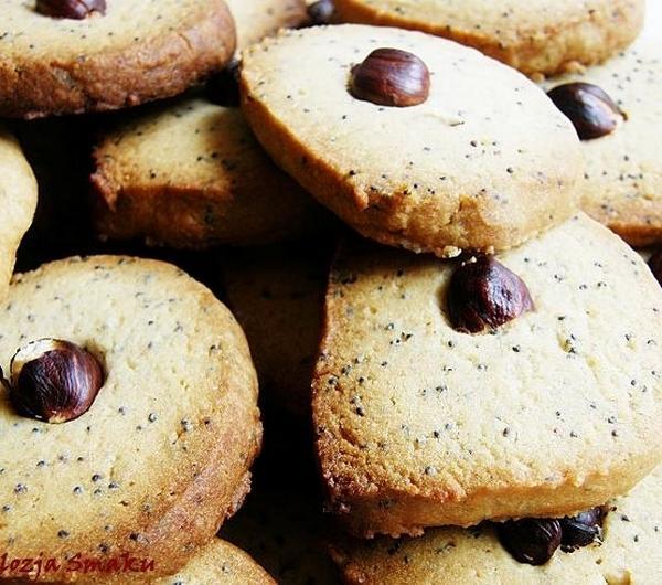 ciasteczka na natłuszczonej blasze do pieczenia, zachowując 2 cm odstępu. W środek każdego krążka wcisnąć połówkę