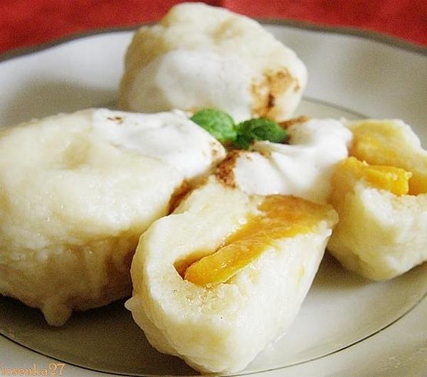 Czasami obiad mięsny nie jest zbyt atrakcyjny, zwłaszcza latem kiedy jest tak wiele możliwości. Od dawna miałam ochotę na knedle, a że w sklepach i na targu zatrzęsienie owoców nie mogłam się oprzeć. Kupiłam brzoskwinie i zrobiłam knedle serowe. Ciasto podobne jak na leniwe . Polane śmietaną z cukrem i posypane cynamonem smakowały rewelacyjnie. Jest to moja propozycja do akcji Karoliny Morelkowo-Brzoskwiniowo .Składniki:30 dag sera białego1 jajko1 szklanka mąki pszennejszczypta solibrzoskwinie ew. moreleśnietanacukiercynamonSer zemleć, dodać jajko, sól i mąkę, dokładnie wymieszać. Urywać po kawałku ciasta, wkładać w środek cząstkę brzoskwinii lub połówkę moreli i formować kulki. Gotować w osolonej wodzie około 10 minut. Brzoskwinie w środku powinny być lekko rozgotowane. Podawać ze śmietanącukrem i cynamonem, jeśli ktoś lubi.Smacznego:)