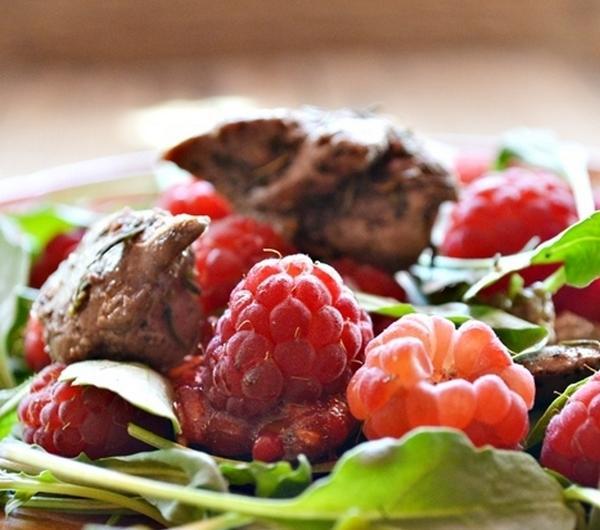 Źródło: Moje smaki życia + moje zmianySkładniki:250 g malingarść rukoli10 łyżek oleju1/2 kg wątróbek drobiowychsól, pieprz, tymianek do smaku4 łyżki oliwyRukolę umyć, osuszyć, rozłożyć na talerzu. Kilka malin odłożyć, pozostałe rozgnieść, przetrzeć przez sito, połączyć z oliwą, dodać sól, pieprz i tymianek, wymieszać. Wątróbkę usmażyć na rozgrzanym oleju. Oprószyć sola i pieprzem i przełożyć na sałatę. Polać sosem malinowym, na wierzchu ułożyć pozostałe maliny.Smacznego:)