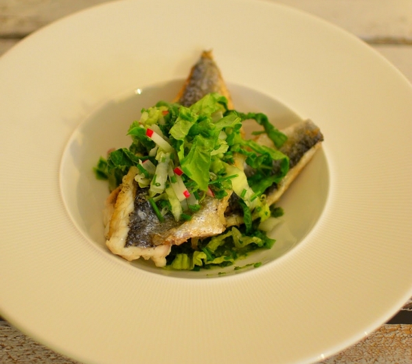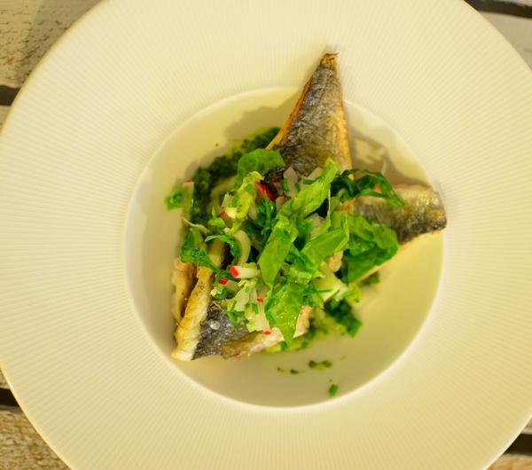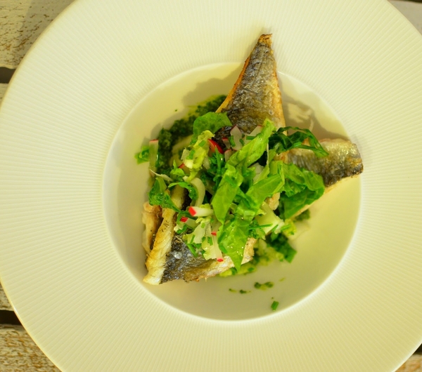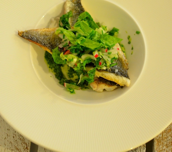 ryba, serwowana na pesto, którym też można było musnąć chrupiącą