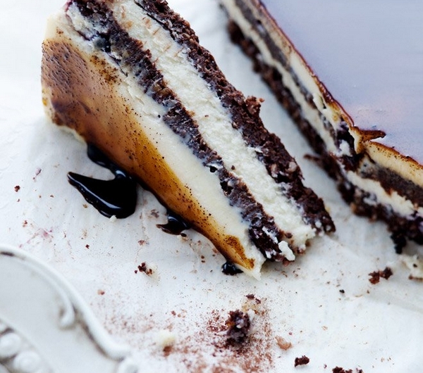 czekoladę. Wszystkie składniki wymieszać dokładnie łyżką, masę podzielić na pół.Wyłożyć połowę masy na dnie tortownicy, wyrównać powierzchnię i wstawić do piekarnika, piec przez 13 minut. W międzyczasie przygotować masę