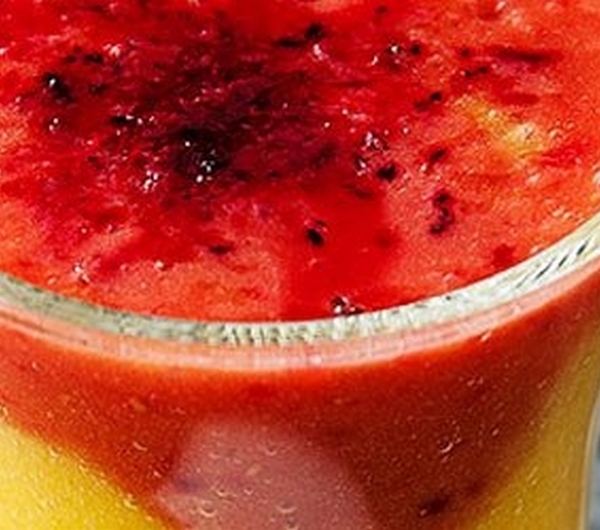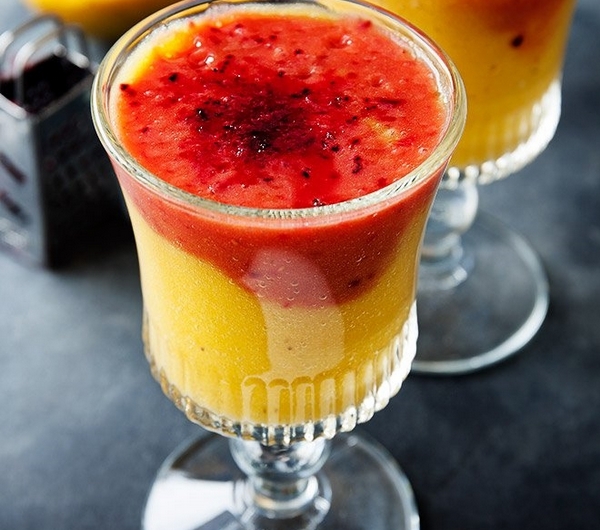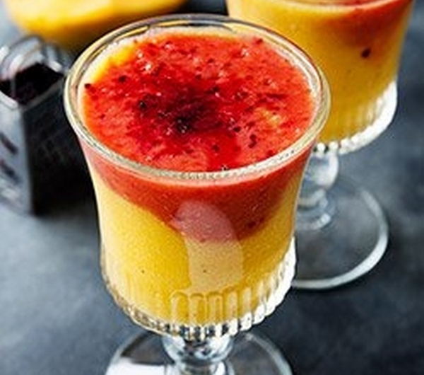 01 5admin5 / 5 starsDwukolorowe smoothie z mango, banana i pomarańczybez dodatku produktów mlecznychSkładniki2 porcje1/2 dojrzałego mango1 średni banan80 ml purée (pulpy) z marakui lub 2 łyżki soku z cytryny lub limonkisok z 2 większych pomarańczykilka wiśni (mrożonych lub świeżych)Do dekoracji: starta na tarce mrożona wiśniaPrzygotowanieDo kielicha stojącego blendera włożyć miąższ obranego mango, dodać obranego banana, purée z marakui lub sok z cytryny oraz sok z pomarańczy. Zmiksować na gładki mus. Około 2/3 musu przelać do szklanek, a do części pozostałej w blenderze dodać wiśnie, zmiksować. Pomarańczową lub czerwoną część musu wylać lub wyłożyć łyżką na część żółtą. Wierzch można posypać tartą mrożoną wiśnią. Smacznego!