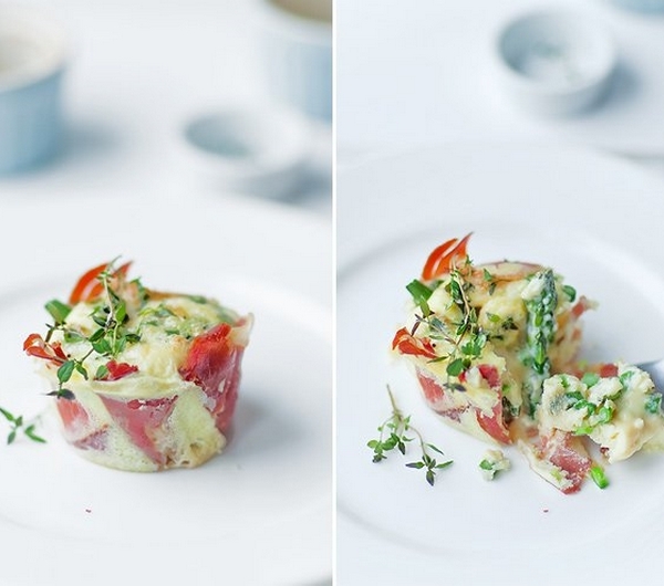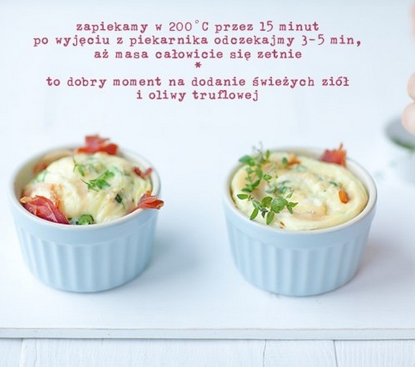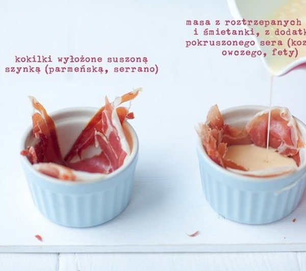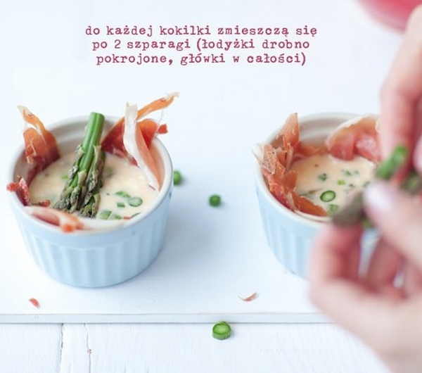 Składniki2 porcje3 plasterki szynki parmeńskiej lub szynki serrano lub innej szynki suszonej4 zielone szparagi3 duże jajka1/4 szklanki śmietanki kremowej 30%50 g ulubionego sera (fety, sera koziego lub owczego)świeży tymianekoliwa truflowaPrzygotowaniePiekarnik nagrzać do 200 stopni. 2 żaroodporne ramekiny wyłożyć plasterkami szynki parmeńskiej. Szparagi opłukać, odłamać zdrewniałe końce (same złamią się w odpowiednim miejscu), łodyżki pokroić na 3 milimetrowe plasterki a końcówki pozostawić w całości.Do miski wbić jajka, dodać śmietankę kremówkę, doprawić solą i pieprzem, roztrzepać rózgą lub zmiksować, dodać pokruszony ser. Masę wlać do kokilek, dodać szparagi, najpierw pokrojone później główki. Wstawić do nagrzanego piekarnika i zapiekać przez 15 minut.Wyjąć z piekarnika i odczekać około 3 - 5 minuty przed wyłożeniem na talerze aby masa całkowicie się ścięła. Posypać listkami tymianku i skropić oliwątruflową.