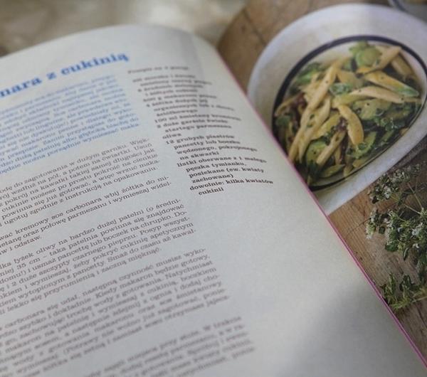 sól morska i świeżo mielony pieprz6 średniej wielkości zielonych i żółtych cukinii500 g penne4 duże żółtka (z jaj od kur z wolnego chowu)100 ml śmietany 40%2 duże garści świeżo startego parmezanuoliwa12 plastrów pancetty lub wędzonego boczku, pokrojonych na skwareczkimały pęczek świeżego tymianku, z którego należy oberwać listki, a kwiatki zachować do dekoracjiWstawcie na gaz osoloną wodę w dużym garnku. Cukinie przekrójcie wzdłuż, najpierw na pół, a następnie na ćwiartki. Wytnijcie gniazda nasienne i pokrójcie cukinię pod kątem na kawałki o podobnej wielkości i kształcie, jak penne. Mniejsze cukinie można po prostu pokroić na plasterki. W tym momencie powinna zawrzeć woda, wrzućcie więc do niej penne i gotujcie, zgodnie z zaleceniami na opakowaniu. Włóżcie żółtka do miski, dodajcie śmietanę i połowę parmezanu i wymieszajcie wszystko widelcem. Przyprawcie odrobiną pieprzu i soli i odstawcie na bok.Wstawcie na gaz dużą patelnię z grubym dnem (wystarczy taka o średnicy 35 cm, powinna się znaleźć w każdej kuchni!), wlejcie kilka łyżek oliwy i podsmażcie pancettę lub boczek, aż skwareczki będą rumiane i chrupiące. Dołóżcie cukinię, posypcie ją dwiema dużymi szczyptami pieprzu, by miała wyraźnie ostry smak. Posypcie listkami tymianku, wymieszajcie, aby cukinia pokryła się smakowitą oliwą z boczkiem i smażcie, aż lekko zmięknie i zacznie się przyrumieniać.Następny etap musicie wykonać właściwie, jeśli nie chcecie zepsuć carbonary. Tu trzeba działać szybko. Odcedźcie ugotowany makaron, zostawiając na dnie garnka trochę wody. Błyskawicznie wymieszajcie na patelni makaron z cukinią i boczkiem, następnie zdejmijcie patelnię z ognia i dolejcie chochelkę wody, pozostałej z gotowania makaronu i wlejcie śmietanę z jajkami i parmezanem. Szybko wszystko wymieszajcie. (Od tego momentu żadnego podsmażania, bo z jajek zrobi się wam jajecznica).Zawołajcie wszystkich do stołu, ta potrawa musi być jedzona natychmiast! Mieszając makaron z sosem wsypcie pozostały parmezan. Możecie dolać jeszcze trochę wody z gotowania makaronu, aby sos stał się lśniący i jedwabisty. Spróbujcie i ewentualnie przyprawcie solą i pieprzem do smaku. Jeśli udało się wam dostać kwiaty cukinii, ułóżcie je, porozrywane, na wierzchu, a następnie czym prędzej podawajcie i zajadajcie, zanim sos stężeje. © Jamie Oliver"Jamie Oliver w domu. Przez gotowanie do lepszego życia"Nie przypominam sobie, żebym na jakąkolwiek książkę kulinarną czekała tak niecierpliwie, jak książkę niejako podsumowującą program kulinarny "Jamie w domu". Wydawać by się mogło, że wystarczy obejrzenie odcinków (wciąż są powtórki) i przepisy na stronie kuchnia.tv, ale ja mam ogromny sentyment do książek i byłam przekonana, że książka to będzie znacznie więcej niż tylko program telewizyjny.Podglądałam zapowiedzi nowości w Merlinie, zaglądałam na strony wydawnictwa Muza, które wydaje wszystkie książki Jamiego w Polsce i ... cisza. W maju 2008 roku, jako stała czytelniczka ich książek napisałam bardzo entuzjastyczny i rozniecierpliwiony list do Muzy z zapytaniem kiedy, och kiedy i jak będzie wydana książka?? Niestety, może wydawnictwo za duże, może skrzynki pocztowe zbyt przepastne, mail przepadł i nie doczekał się odpowiedzi.Długo wyczekiwana pozycja ukazała się z poślizgiem - na początku 2009 roku, a ja juz w przedsprzedaży zamówiłam ją w ulubionej księgarni internetowej :) Od tamtej pory, oprócz własnego egzemplarza zdążyłam już nabyć kolejne 4 na prezenty dla znajomych - wszystkie były zachwycone.