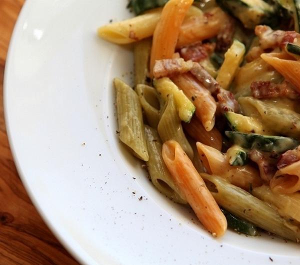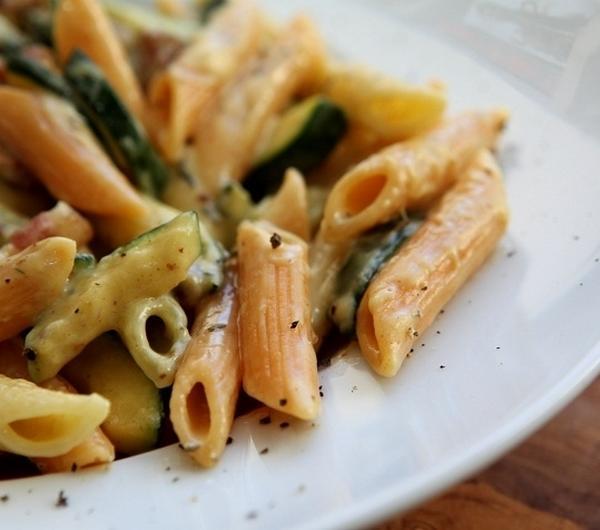 Pędzę czynić własne penne zucchini carbonara z cytrynowym tymiankiem, a przepis podaję za Jamiem, skorzystałam jednak z przepisu na stronie kuchnia.tv, nie miałam siły przepisywać go z książki :)Carbonara to klasyczny sos do makaronu ze śmietany, boczku i parmezanu. Jest absolutnie przepyszny! Postarajcie się kupić składniki najlepszej jakości, bo to dzięki nim to danie jest zachwycające. Ja używam do tego tymianku z kwiatkami, ale zwykły tymianek też się nada. Do tego sosu pasuje makaron typu spaghetti lub linguine, ale włoskie Mammy powiedziały mi (a z nimi nie będę polemizował), że w oryginalnym przepisie jest penne, dlatego ja używam właśnie tego rodzaju makaronu. Zanim zabierzecie się za gotowanie, upewnijcie się, że macie naprawdę dużą patelnię (można wziąć głęboką brytfankę), bo to danie wymaga energicznego potrząsania przy mieszaniu.
