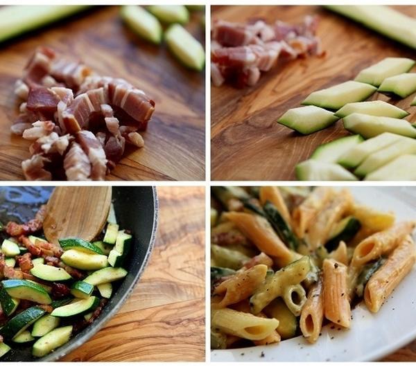 I znów, gdy kroją cukinię i boczek do tego dania, włączam piosenkę Tima Kay, z czołówki programie Jamiego. Przypominam sobie jego piękny ogród warzywny, nucę i szykuję składniki ... klik ...Jamie tak fantastycznie opowiada i pokazuje jak zrobić tę carbonarę, że ślinianki zaczynają szaleć i od razu rozglądasz się, czy masz w kuchni wszystkie składniki :) Chciałabym Wam tu wkleić fragment jego programu, gdzie Jamie pokazuje jak proste jest przygotowane tej wersji, jednak film już nie jest dostępny w sieci, o czym doniósł mi jeden z czytelników bloga (dziękuję Maćku).