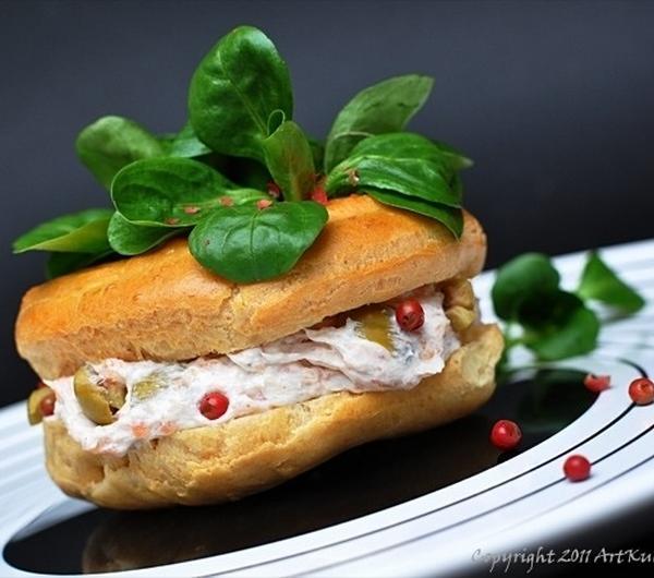 ciastka ptysiowe przekroić w poprzek na pół. Farsz włożyć do szprycy wycisnąć na dolną część