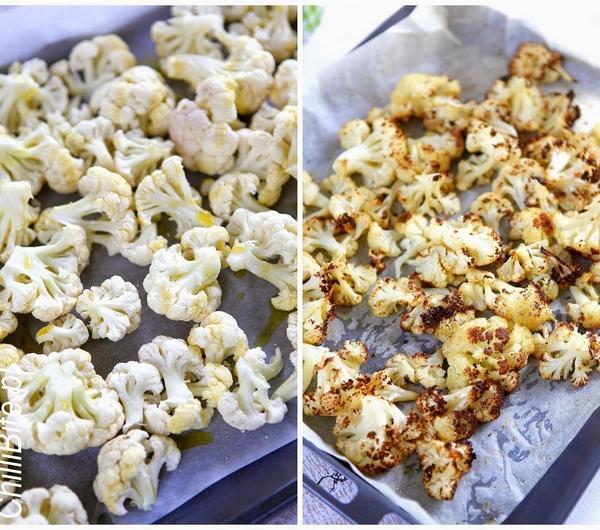 kalafiora na blasze. Piecz do chwili, gdy lekko się zezłoci.Na dużej suchej patelni lub w garnku upraż kumin, aż zacznie ładnie pachnieć, następnie dodaj łyżkę