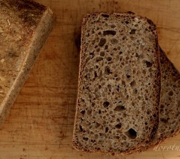Znakomity w smaku chleb pszenno - żytni, który nie jest najprostszy do formowania ... dlatego piekę go zawsze w foremce (oszczędza to moje nerwy ;). Smakuje idealnie, charakterystycznie 'zakwasowo', przy tym ma miękki i klejący miąższ, taki, jaki lubię ... jaki wszyscy w domu lubimy. Przepis Tatter z 'Tatter o chlebie'.Składniki:270 g żytniego zakwasu135 g żytniej mąki razowej (użyłam mąki pszennej razowej)180 g mąki pszennej *200 g wody, letniej1 g suchych drożdży (1/4 łyżeczki) lub 2 g drożdży świeżych9 g soliWszystkie składniki wymieszać w misce i pozostawić na 45 minut, nastepnie złożyć ciasto (można jedynie przemieszać)** i znów zostawić na 45 minut. Nastepnie uformować podłużny bochenek i złączeniem w górę ułożyć go w omączonym koszu***. Pozostawić do wyrośnięcia (około 1,5 - 2 h; ciasto ma prawie podwoić swoją objętość). Rozgrzać piekarnik wraz z kamieniem do 260ºC. Wyrośnięty chleb przełożyć na łopatę, szybko naciąć i zsunąć na rozgrzany kamień.Piec z parą przez 10 minut (250ºC) następnie obniżyć temperaturę do 220ºC i piec jeszcze 35 minut. Studzić na kratce.Metoda dla maszynistów:Wszystkie składniki na chleb umieścić w maszynie w kolejności: płynne, sypkie, na końcu drożdże. Nastawić program do wyrabiania i wyrastania ciasta 'dough', po wymieszaniu ciasta i odczekaniu 45 minut zresetować maszynę, nastawić program od nowa. Po wyrobieniu i kolejnych 45 minutach wyrastania ciasto wyjać, uformować i wyłożyć do formy/koszyka. Dalej postępować według przepisu.Smacznego :)* zawsze dosypuję około pół szklanki mąki więcej** ciasto jest bardzo luźne, zdecydowanie do wymieszania, nie składałam*** z powyższego powodu piekłam chleb w formie, więc ułożyłam w niej chleb od razu (forma wysmarowana masłem i wysypana otrębami o wymiarach 14 x 26 cm lub mniejsza)