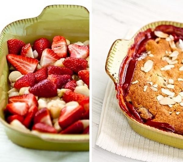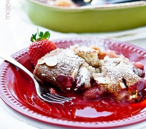Cobbler to owoce pieczone pod pierzynką z ciasta. Kojarzy mi się z crumble, bo - choć nie ma w nim kruszonki - sposób podania jest podobny. Najczęściej na ciepło, z lodami lub bitą śmietaną... I dobra wiadomość - nie trzeba się martwić o zakalec, ponieważ owoce są na spodzie ;-). Ciasto bywa lekkie, lub bardziej kruche, ciasteczkowe; w tym przepisie jest bardzo lekkie i możecie mąkę pszenną zastąpić orkiszową lub pszenną razową. Deser nie można zaliczyć do najbardziej eleganckich, ale jest za to bardzo smaczny; nadają się do niego wszelkie owoce, łącznie z mrożonymi.Składniki na spód z owoców:450 g rabarbaru450 g truskawek1 szklanka cukru (lub mniej, wedle uznania i w zależności od owoców)3,5 łyżki skrobi ziemniaczanejSkładniki na ciasto:210 g masy marcepanowej (lub pasty migdałowej)1/3 szklanki cukru115 g masła, w temperaturze pokojowej1 duże jajkopół łyżeczki ekstraktu z wanilii lub migdałów1 szklanka mąki pszennej1,5 łyżeczki proszku do pieczeniaszczypta solipół szklanki mlekaRabarbar obrać, usunąć skórkę, pokroić na mniejsze kawałki, umieścić w małym garnuszku, pogotować około 1 minuty, do lekkiego zmięknięcia.Przygotować formę żaroodporną o wymiarach około 20 x 28 cm. Przełożyć do niej przygotowany rabarbar, następnie odszypułkowane truskawki, przekrojone na pół, zasypać cukrem i oprószyć skrobią ziemniaczaną. Odstawić.Masę marcepanową umieścić w misie miksera, dodać cukier i zmiksować.* Dodać masło, zmiksować. Kolejnie dodawać jajko, ekstrakt i miksować po każdym dodaniu, do połączenia się składników.Mąkę wymieszać z proszkiem i solą. Na zmianę z mlekiem dodawać do ciasta, miksując, tylko do połączenia się składników. Przygotowane ciasto wyłożyć łyżką na owoce. Nierówno, by owoce gdzieniegdzie wystawały, by mogły parować i 'bąbelkować' (u mnie ciasto rosnąc w piekarniku i tak przykryło owoce). Dodatkowo wierzch można posypać np. płatkami migdałów.Piec w temperaturze 180ºC przez około 45 minut lub do tzw. suchego patyczka. Wyjąć, przestudzić przez 10 minut, oprószyć pudrem i podawać ciepłe.Smacznego :-).* Przez kilkanaście sekund ogrzałam masę marcepanową w mikrofali, na małej mocy, by była bardziej miękka i łatwiejsza w obróbce.