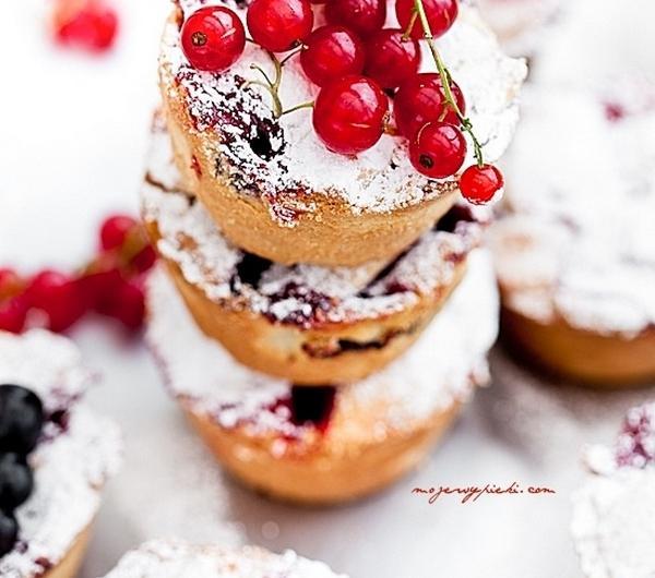 Przepyszne kruche babeczki z nadzieniem z porzeczki czerwonej lub czarnej. Bez konieczności wcześniejszego podpiekania spodu, przyozdobione paseczkami kruchego ciasta ułożonymi na kształt kratki. Babeczki świetnie się przechowują i pozostają kruche i smaczne przez kilka dni, warto je przygotować z wyprzedzeniem. Polecam :-).Składniki na kruche ciasto (18 babeczek):450 g mąki pszennej150 g masła, zimnego100 g smalcu, zimnego1 żółtko100 g cukru pudru3 łyżki mleka, zimnegoMąkę przesiać, dodać masło, smalec, posiekać, dodać żółtko, cukier, mleko, szybko zagnieść, owinąć folią (można również zmiksować w malakserze). Odłożyć na 1 - 2 godziny do lodówki.Przygotować klasyczną formę do muffinek (mogą to być też metalowe pojedyncze karbowane foremki na babeczki). Wysmarować masłem i oprószyć mąką, nadmiar mąki strzepać.Nadzienie porzeczkowe:500 g porzeczek (u mnie czerwona i czarna pół na pół)3 łyżki skrobi (mąki) ziemniaczanej lub skrobi kukurydzianej150 g cukruDodatkowo:1 jajko roztrzepane z 1 łyżką mleka do posmarowania babeczekPorzeczki przełożyć do miseczki, delikatnie wymieszać ze skrobią i cukrem.Schłodzone ciasto wyjąć z lodówki. Podsypując delikatnie mąką rozwałkować na grubość około 2 -3 mm. Szerokim kubkiem lub foremką do wycinania ciastek wycinać koła, umieszczać je formie na muffinki, wylepić dokładnie dno i boki, dociskając. Do środka nałożyć nadzienia porzeczkowego, do wysokości babeczek. Z pozostałego ciasta wycinać paski kruchego ciasta i ułożyć je w kratkę na babeczkach. Posmarować roztrzepanym jajkiem.Piec w temperaturze 190ºC przez około 25 minut, do zezłocenia się ciasta (pod koniec pieczenia nadzienie porzeczkowe zacznie się wyraźnie gotować wewnątrz i 'bąbelkować' ponad babeczki). Wyjąć, przestudzić lekko w foremkach, następnie wystudzić na kratce.Wystudzone można oprószyć cukrem pudrem, ale nie jest to konieczne.Smacznego :-).