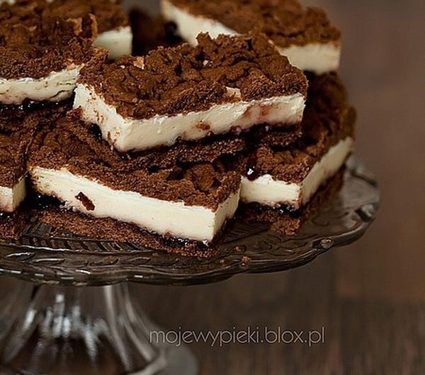 Smaczny sernik z kakaowym kruchym ciastem i cytrynową pianką. Z pianką, która najcześciej znika pod ciężarem kruchego ciasta.. ale nadaje mu świetnego, cytrynowego smaku. Sernik nie jest przesłodzony, a dodatek kwaśnego dżemu (np. z czarnych porzeczek) doskonale równoważy jego smak. Kiedyś piekłam go częściej, ale lubię do niego wracać :-).Składniki na ciasto kruche:450 g mąki pszennej100 g cukru pudru250 g masła3 żółtka2 płaskie łyżki kakao2 łyżeczki proszku do pieczeniaWszystkie składniki ciasta szybko wyrobić i zagnieść (można w malakserze). Ciasto podzielić na 2 części, owinąć folią spożywczą, spłaszczyć. Jedną część włożyć do lodówki na godzinę, a drugą zamrozić.Masa serowa:600 g twarogu półtłustego lub tłustego, zmielonego przynajmniej dwukrotnie100 g drobnego cukru do wypieków3 żółtkapół opakowania proszku budyniowego śmietankowego bez cukru (20 g)5 łyżek oleju (75 ml)50 g rodzynków (niekoniecznie)Żółtka utrzeć z cukrem na jasną i puszysty krem (kogel mogel). Dolewać po łyżce oleju, dalej ucierać. Do masy dodawać po łyżce zmielonego sera, ucierać. Wsypać budyń, rodzynki, wymieszać.Pianka cytrynowa:4 białkakisiel cytrynowy bez cukru4 łyżki cukruBiałka ubić na sztywno, pod koniec ubijania dodając stopniowo cukier, łyżka po łyżce. Dodać przesiany kisiel i delikatnie wymieszać, do połączenia.Ponadto:1 słoik powideł lub dżemu z czarnej porzeczki (około 250 - 300 g)Schłodzone ciasto rozwałkować i ułożyć na blaszce (wcześniej wyłożonej papierem do pieczenia) o wymiarach 25 x 35 cm. Na cieście rozsmarować powidła. Wyłożyć masę serową, wyrównać. Na ser delikatnie wyłożyć piankę. Na wierzch zetrzeć na tarce z grubymi oczkami zamrożone ciasto.Piec około 1 godziny w temperaturze 170ºC. Studzić w lekko uchylonym piekarniku.Smacznego :-).