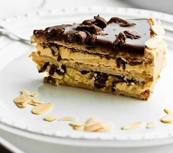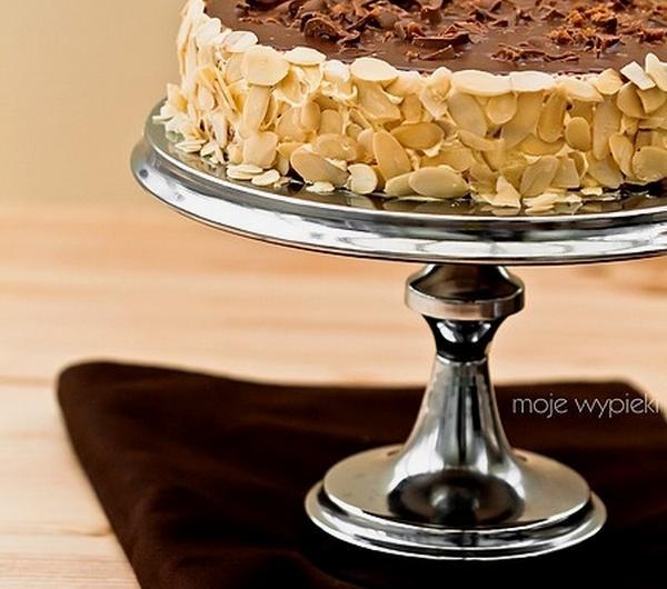 Słodkie migdałowo - czekoladowe ciasto przypominające szwedzką tartę migdałową z batonikami daim. Ulubioną przez wielu czytelników Moich Wypieków :). Przyznam, że jedliśmy tartę w znanej sieciówce, ale szczególnie nie wpadła w moje kubki smakowe, a na pewno nie tak, jak same batoniki daim ;-). Dodatek tych batoników uważam za niezbędny, by ciasto lepiej smakowało i mocno chrupało. Bez nich - to już nie będzie to samo.. Krem użyty do przełożenia blatów migdałowych jest dość ciężki i maślany, ale ponieważ ciasto jest niewysokie i niewielkich rozmiarów, można przygotować je od czasu do czasu.. prawda? Polecam do wypróbowania :-).Składniki na blaty bezowe:4 białka150 g drobnego cukru do wypieków100 g zmielonych migdałów1 łyżka mąki ziemniaczanejBiałka ubić w misie miksera na sztywną masę. Nie przerywając ubijania dodawać cukier, stopniowo, łyżka po łyżce, aż do wyczerpania.Migdały wymieszać z mąką, dodać do ubitych białek i delikatnie wymieszać szpatułką.3 formy o średnicy 20 - 21 cm* wyłożyć papierem do pieczenia (same dno). Pomiędzy formy równo rozdzielić masę bezową. Piec w temperaturze 180ºC przez 15 - 20 minut (piekłam dłużej, około 30 minut) do zezłocenia.Wyjąć z piekarnika, wystudzić.Składniki na waniliowy krem maślany:4 żółtka100 g cukru z wanilią200 ml śmietany kremówki150 g masła, w temperaturze pokojowej2 łyżki soku z cytryny lub likieru cytrynowegoDo garnuszka wlać kremówkę, dodać żółtka i cukier z wanilią. Roztrzepać rózgą, do połączenia. Podgrzewać na małej mocy palnika, mieszając, do zgęstnienia. Nie dopuścić do wrzenia; przed samym momentem wrzenia ściągnąć garnuszek z palnika. Ostudzić.W misie miksera utrzeć masło na jasną i puszystą masę. Stopniowo, łyżka po łyżce, dodawać przestudzony budyń, ucierając. Na sam koniec dodać sok z cytryny bądź likier, utrzeć.Polewa czekoladowa:100 g mlecznej czekolady, posiekanej50 - 70 ml śmietany kremówkiKremówkę przelać do garnuszka, podgrzewać na małej mocy palnika. Dodać posiekaną czekoladę i mieszać, do uzyskania gładkiej masy. Ściągnąć z palnika i lekko przestudzić, by polewa zgęstniała i nie spływała z ciasta.Ponadto:140 g cukierków lub batoników Daim**, posiekanychpłatki migdałów do udekorowania bokówWykonanie:Waniliowy krem maślany podzielić na 3 równe części.Jeden blat bezowy położyć na paterę. Posmarować jedną częścią kremu, posypać posiekanymi cukierkami. Przykryć drugim blatem. Na blat wyłożyć drugą część kremu, posypać cukierkami. Przykryć ostatnim blatem. Pozostały krem rozsmarować po bokach tortu, udekorować migdałami.Na wierzch wylać gęstą, ochłodzoną polewę, wyrównać. Posypać posiekanymi batonikami. Schłodzić przez kilka godzin w lodówce, a najlepiej przez całą noc.Smacznego :).* blaty bezowe można również piec bez formy, po uprzednim narysowaniu na papierze do pieczenia okręgów o średnicy 21 cm, pieczemy wszystkie blaty na raz, z termoobiegiem** można je zastąpić mlecznymi karmelkami typu np. werthers originalUWAGA, w wersji bezglutenowej należy pominąć batoniki daim lub zastąpić je bezglutenowymi odpowiednikami.
