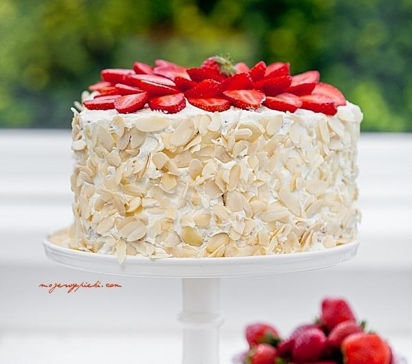 Moja propozycja na Dzień Matki. Wyjątkowy i delikatny tort migdałowy - migdałowy biszkopt nasączony likierem migdałowym, świeży krem śmietankowy i truskawki. Smacznie, skromnie, z gracją. Tort upiekłam w formie w kształcie serca, ale to od Was zależy ostateczny kształt. Gorąco polecam!Uwaga: składniki poniżej są na 1 blat migdałowy w kształcie serca. Należy upiec 3 takie same blaty, czyli w rezultacie potroić ilość składników. Jeśli posiadacie wysoką tortownicę w kształcie serca można od razu potroić ilość składników i upiec 1 duży biszkopt, po wystudzeniu przekroić go na 3 części.Składniki na 1 blat migdałowy:2 duże jajka1 łyżka letniej wody1/2 szklanki drobnego cukru do wypieków (lub odrobinę mniej)pół szklanki mąki pszennej np. tortowejpół szklanki zmielonych migdałów1/4 łyżeczki proszku do pieczenia1/2 łyżeczki ekstraktu z migdałówWszystkie składniki powinny być w temperaturze pokojowej.Do misy miksera wbić jajka, wodę, wsypać cukier. Ubijać (końcówkami miksera do ubijania piany z białek) na najwyższych obrotach miksera do momentu uzyskania jasnej, puszystej masy. Masa podnoszona na mieszadle miksera powinna opadać lekko w postaci wstążki na resztę ciasta i pozostawać na jej powierzchni przez kilka dobrych sekund.Do masy jajecznej przesiać mąkę z proszkiem do pieczenia, dodać migdały, ekstrakt i wymieszać delikatnie rózgą kuchenną lub szpatułką do połączenia. Uwaga: mieszamy bardzo delikatnie!Masę przelać do formy w kształcie serca* wysmarowanej masłem i wyłożonej papierem do pieczenia (tylko dno), wyrównać szpatułką.Piec w temperaturze 170ºC przez około 15 - 17 minut lub do tzw, suchego patyczka. Biszkopt powinien być ładnie zarumieniony i sprężysty przy dotyku. Wyjąć, wystudzić.Nasączenie biszkoptu:pół szklanki likieru AmarettoKrem śmietankowy:500 ml śmietany kremówki 36%100 g serka mascarpone2 łyżki cukru pudru2 łyżki likieru AmarettoWszystkie składniki powinny być schłodzone.Wszystkie składniki na krem (oprócz likieru) umieścić w misie miksera (tak, wszystkie razem) i rozpocząć ubijanie (końcówką miksera do ubijania piany z białek). Ubijać do momentu otrzymania gęstego, ścisłego kremu - mieszadło miksera będzie pozostawiało na nim ślad a krem nie będzie spływał z łyżki. Pod sam koniec dodać likier i ubić.Ponadto:500 g truskawekpłatki migdałów do dekoracji boków tortuWykonanie:Pierwszy blat tortu ułożyć na paterze, nasączyć 1/3 ponczu. Na blat wyłożyć 1/3 kremu śmietankowego, wyrównać. Na kremie poukładać pokrojone w plasterki truskawki. Przykryć drugim blatem biszkoptowym, nasączyć połową pozostałego ponczu. Wyłożyć połowę pozostałego kremu śmietankowego, wyrównać. Na kremie ponownie poukładać plasterki truskawek. Przykryć ostatnim blatem biszkoptu, nasączyć pozostałym Amaretto. Boki i wierzch tortu posmarować pozostałym kremem. Boki tortu obsypać płatkami migdałów. Wierzch tortu udekorować plasterkami truskawek.Przechowywać w lodówce.* Wymiary formy serce: 20 cm od wcięcia do koniuszka serca i 21 cm szerokości mierzonej w najszerszym miejscu formy.Smacznego :-).