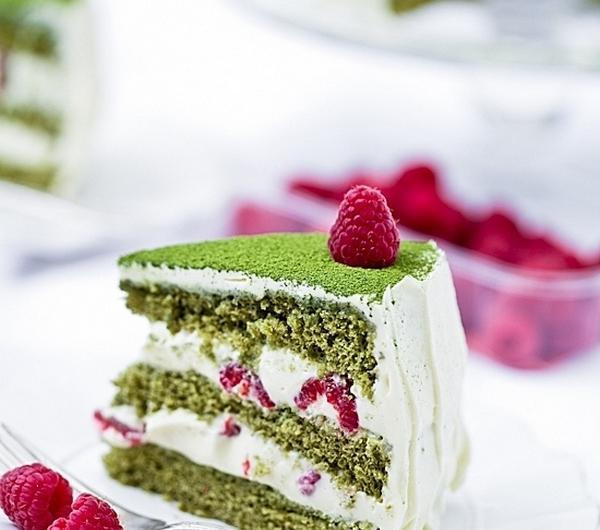 Tort, który będzie sporą niespodzianką na każdej letniej imprezie.. zielony tort z wykorzystaniem herbaty matcha! Możliwe, że Wasi goście nigdy takiego nie jedli, a pomysł im się tak spodoba, że wezmą przepis ;-). Tort na tradycyjnym biszkopcie wzbogaconym herbatą matcha, która nadaje mu koloru i smaku. Krem z białej czekolady, który przełamuje lekką gorycz herbaty i maliny, które są przysłowiową kropką nad i.. Tort wyjątkowy i wykwintny, który wzbogaci i uświetni każdą uroczystość i prawdopodobnie będzie też tortem najbardziej zapamiętanym! Mnie urzekł smakiem, delikatnością, skradł też serca naszych gości.. bardzo polecam!Ciasto biszkoptowe:5 jajek3/4 szklanki drobnego cukru do wypieków3/4 szklanki mąki pszennej1/4 szklanki mąki ziemniaczanej1,5 łyżki herbaty matcha (proszku)*/szklanka o pojemności 250 ml/Wszystkie składniki powinny być w temperaturze pokojowej. Mąki przesiać.Białka oddzielić od żółtek, ubić na sztywną pianę (uważając, by ich nie 'przebić'). Pod koniec ubijania dodawać partiami cukier, łyżka po łyżce, cały czas ubijając. Dodawać po kolei żółtka, nadal ubijając. Dodać przesianą herbatę, cały czas ubijając. Mąki dodać do ciasta, delikatnie wymieszać szpatułką.Tortownicę o średnicy 22 - 23 cm (piekłam w formie o średnicy 20 cm i wyskości 7,5 cm) wyłożyć papierem do pieczenia (samo dno), nie smarować boków. Delikatnie przełożyć ciasto. Piec w temperaturze 160 - 170ºC przez około 35 - 40 minut lub do tzw. suchego patyczka.Gorące ciasto wyjąć z piekarnika, z wysokości około 30 cm upuścić je (w formie) na podłogę. Odstawić do uchylonego piekarnika do wystudzenia.Wystudzony biszkopt przekroić na 3 blaty.Uwaga: boki biszkoptu oddzielamy nożykiem od formy dopiero po jego wystudzeniu.Krem z białej czekolady:450 g białej czekolady, posiekanej600 ml śmietany kremówki 36%Śmietanę kremówkę podgrzać w małym garnuszku, do wrzenia, zestawić z palnika. Dodać białą czekoladę, odstawić na 2 minuty. Po tym czasie wymieszać, do roztopienia się czekolady. Wystudzić, wstawić do lodówki do schłodzenia na minimum 12 godzin.Schłodzoną masę czekoladową wyjąć z lodówki i ubić (końcówkami miksera do ubijania białek), do otrzymania gęstego kremu.Uwaga: nie ubijać zbyt długo, by krem się nie zwarzył.Dodatkowo:250 g malin, świeżych lub mrożonych (mrożone należy rozmrozić)1 łyżka herbaty matcha do oprószeniapół szklanki ponczu: wódka wymieszana z zieloną herbatą pół na pół lub tylko herbata w wersji bezalkoholowejWykonanie:Na paterze położyć pierwszy biszkoptowy blat. Naponczować i posmarować grubą warstwą kremu z białej czekolady, w krem powtykać maliny. Przykryć kolejnym blatem biszkoptowym. I znów - nasączyć biszkopt, posmarować grubą warstwą kremu, w który powtykać maliny, większe łamiąc na cząstki. Przykryć ostatnim blatem biszkoptowym i go nasączyć. Wierzch i boki posmarować pozostałym kremem z białej czekolady.Schłodzić (minimum kilka godzin przed podaniem) i przechowywać w lodówce. Przed samym podaniem oprószyć herbatą matcha, przez sitko.Smacznego :-).* Są różne rodzaje/gatunki herbaty matcha, od użytego rodzaju zależy kolor ciasta po wypieku. Czasem matcha może powodować zbrązowienie ciasta po upieczeniu - zamiast oczekiwanego ładnego, zielonego koloru. Do wypieków kupujmy matcha 'baking grade' lub 'cooking grade'. Jedną z lepszych pod względem koloru do wypieków jest herbata matcha w puszce firmy Maeda-en lub Koyu matcha (for cooking and baking).