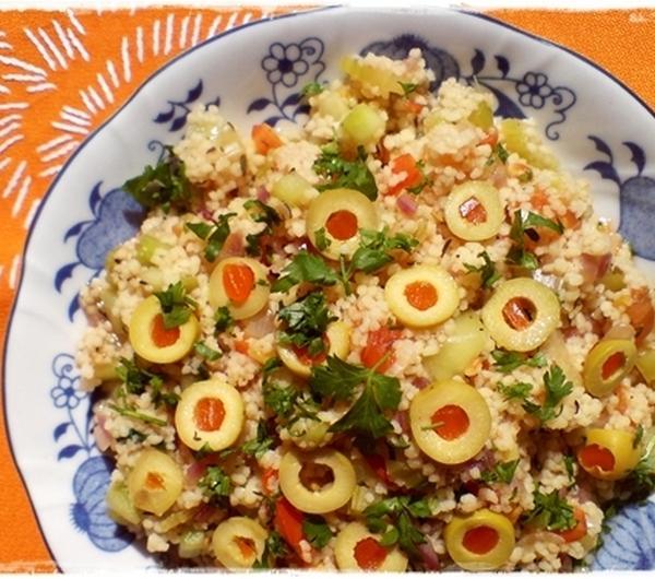 Kuskus zmieszać z warzywami, przyozdobić pokrojonymi w plasterki