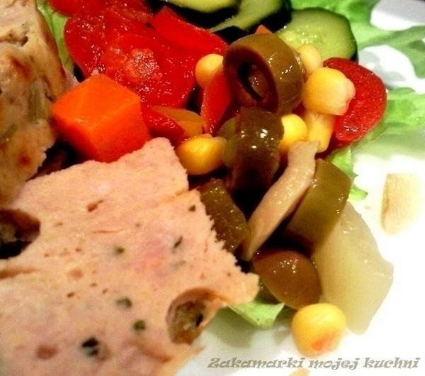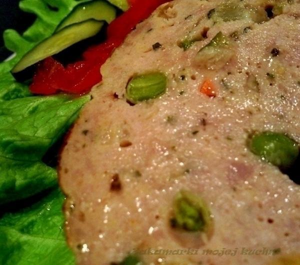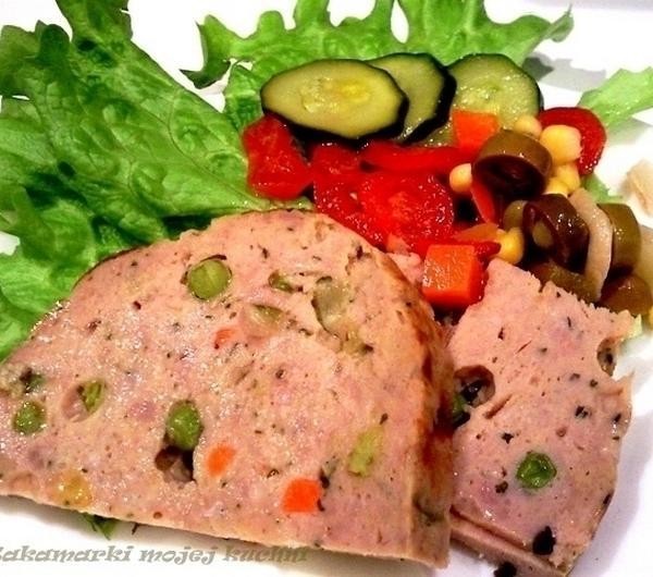 Pokrojoną w kostkę marchewkę i zielony groszek ugotować w osolonej wodzie/warzywa powinny zachować jędrność/, obrane pieczarki pokroić w plastry . Mięso mielone/schłodzone/ przełożyć do głębokiej miski , dodać ricottę, jajko ,bułkę tartą , starty ser, sól , pieprz i paprykę. Masę dokładnie wymieszać .Pod koniec dodać ugotowane -przestudzone warzywa, plastry pieczarek i oliwek, drobno pokrojoną pietruszkę i szczypiorek, delikatnie wymieszać. Z utworzonej masy mięsnej uformować wałek. Rozmiar zależy od tego jakie plastry chcemy otrzymać oraz od wielkości naczynia ,w którym będziemy piec . Jeśli uformujemy wałek cienki należy go piec krócej, jeśli gruby pieczemy ciut dłużej. Naczynie żaroodporne należy dokładnie posmarować oliwą, a następnie umieścić w nim mięso. Piekarnik rozgrzać do temperatury 180 st . Wstawić pieczeń. Kiedy mięso zarumieni się z wierzchu należy przewrócić je na druga stronę, podlać winem i piec ok.40min.W ciągu tego czasy pieczeń należy jeszcze jeden raz odwrócić na drugą stronę. Można również co jakiś czas podlewać ją wytworzonym sosem .Po upieczeniu pieczeń powinna chwilę „odpocząć” ,a później można ją pokroić. Najlepiej kroi się na zimno.