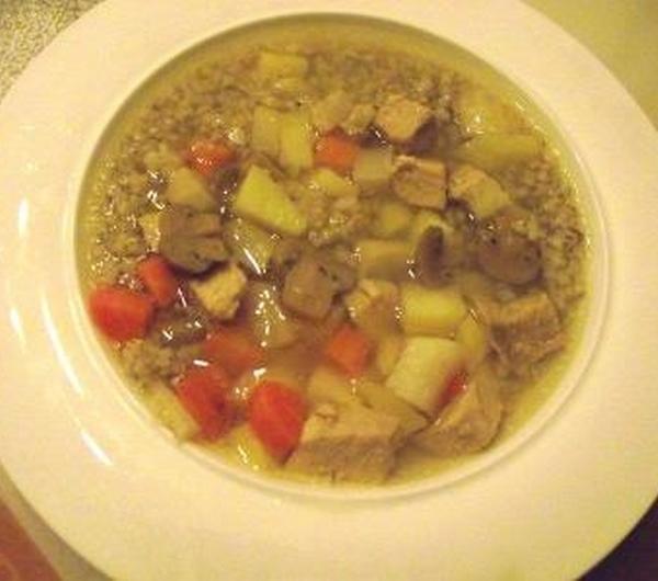 Rozgrzewajaca zupa na zimowe dni. Lubi ja moj synek :)Na 6-7 porcji1 szklanka kaszy perlowejkawalek selera1 korzen pietruszki2 marchewki200 g pieczarek200 g ziemniakow2 l wywaru miesnegosol, pieprzWarzywa oczyscic i pokroic w kostke. Kasze ugotowac, odstawic. Wywar zagotowac, dodac pokrojone marchewki, pietruszke i seler, gotowac ok. 10 min. Nastepnie dodac pokorojone w kostke ziemniaki. Gotowac przez chwile, nastepnie dodac kasze i przesmazone na masle, pokrojone w paski grzyby. Zagotowac, doprawic do smaku.