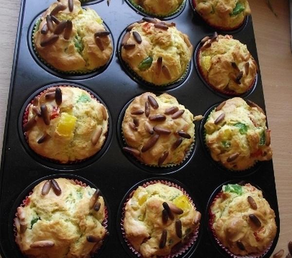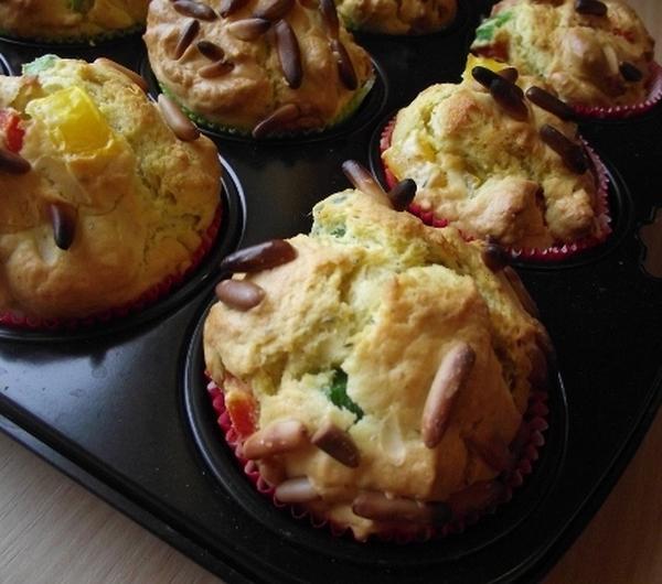Na 12 sztuk:Po polowie straka kolorowych papryk: czerwona, zielona, zolta5 jajek100 g masla2 lyzeczki soli ziolowejszczypta pieprzu kajenskiego1/4 lyzeczki mielonego szafranu300 g maki1 opkowanie proszku do pieczenia (przeznaczone na 500 g maki)1/2 lyzeczki siekanego tymianku (moze byc suszony)50 g orzeszkow piniowychJesli ktos chce moze dolozyc 50 g posiekanych czarnych oliwek.Paparyki umyc i pokroic w kostke. Jajka ubic z maslem, sola, szafranem, tymiankiem i pieprzem kajenskim. Make wymieszac z proszkiem do pieczenia i (ewentualnie) posiekanymi oliwkami. Dodawac stopniowo do plynnej masy i ubic ciasto, nastepnie dodac papryke i wymieszac lyzka. Przelozyc do foremek muffinkowych. Psypac orzeszkami piniowymi. Piec nagrzanym piekarniku w temperaturze 180°C (z termoobiegiem- 160°C) ok. 20 minut.