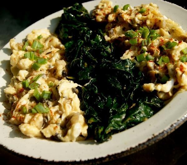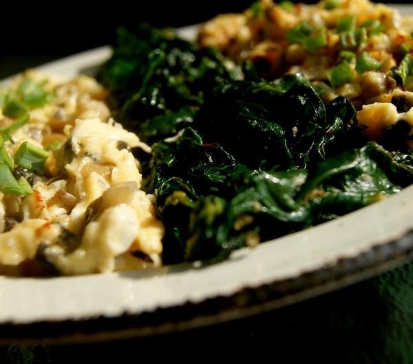 szpinak, po bokach jajecznicę, posypałam świeżą